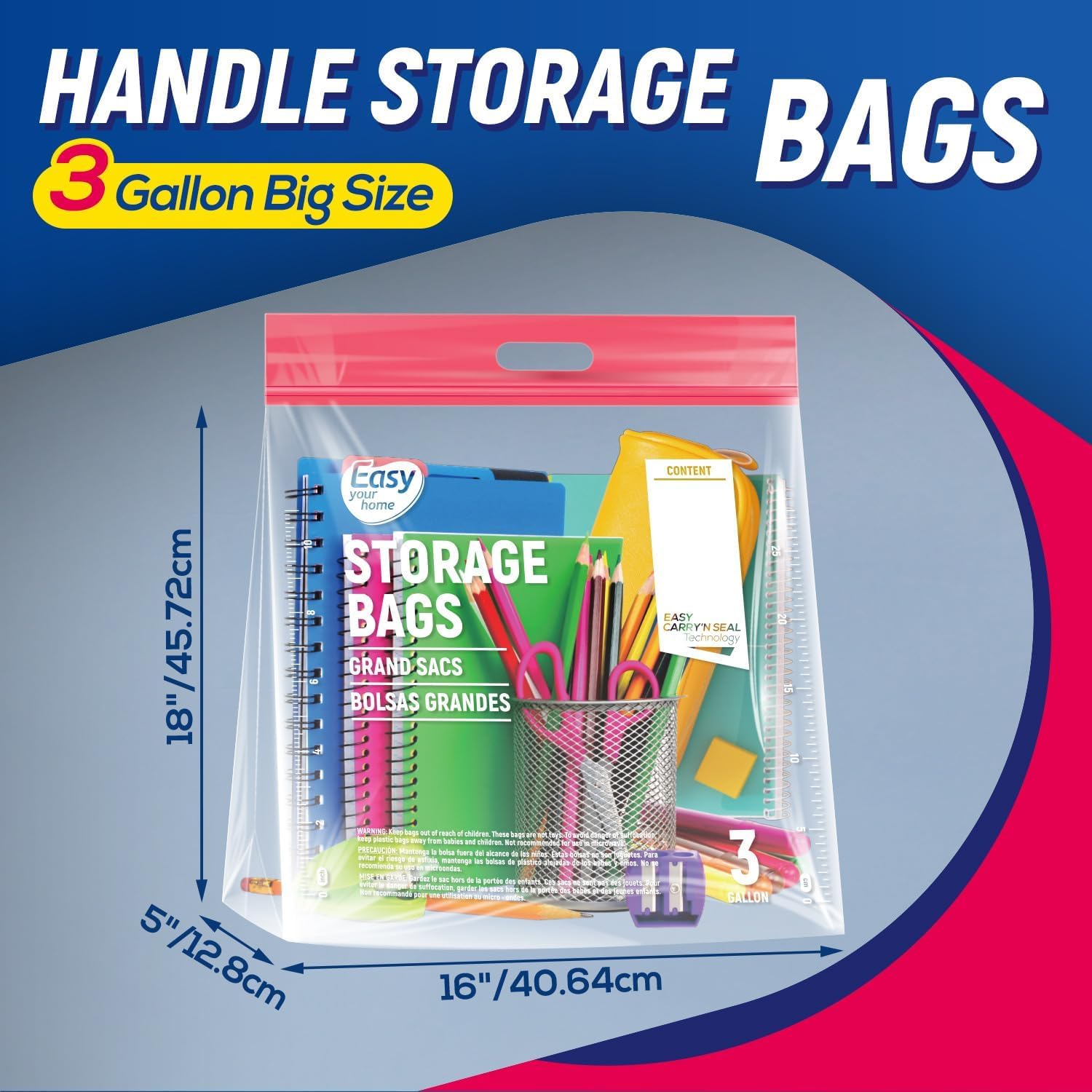 “{Advanced EASY CARRYN SEAL Technology for a Secure Closure} Each of our 5-pack, 3-gallon bags (16″x18″x5”) features innovative EASY CARRYN SEAL technology, with a strong, robust zipper that ensures a secure, leak-proof seal. Additionally, each bag has a writable area where you can label contents, dates, and other important details, allowing you to easily track and manage your items.”