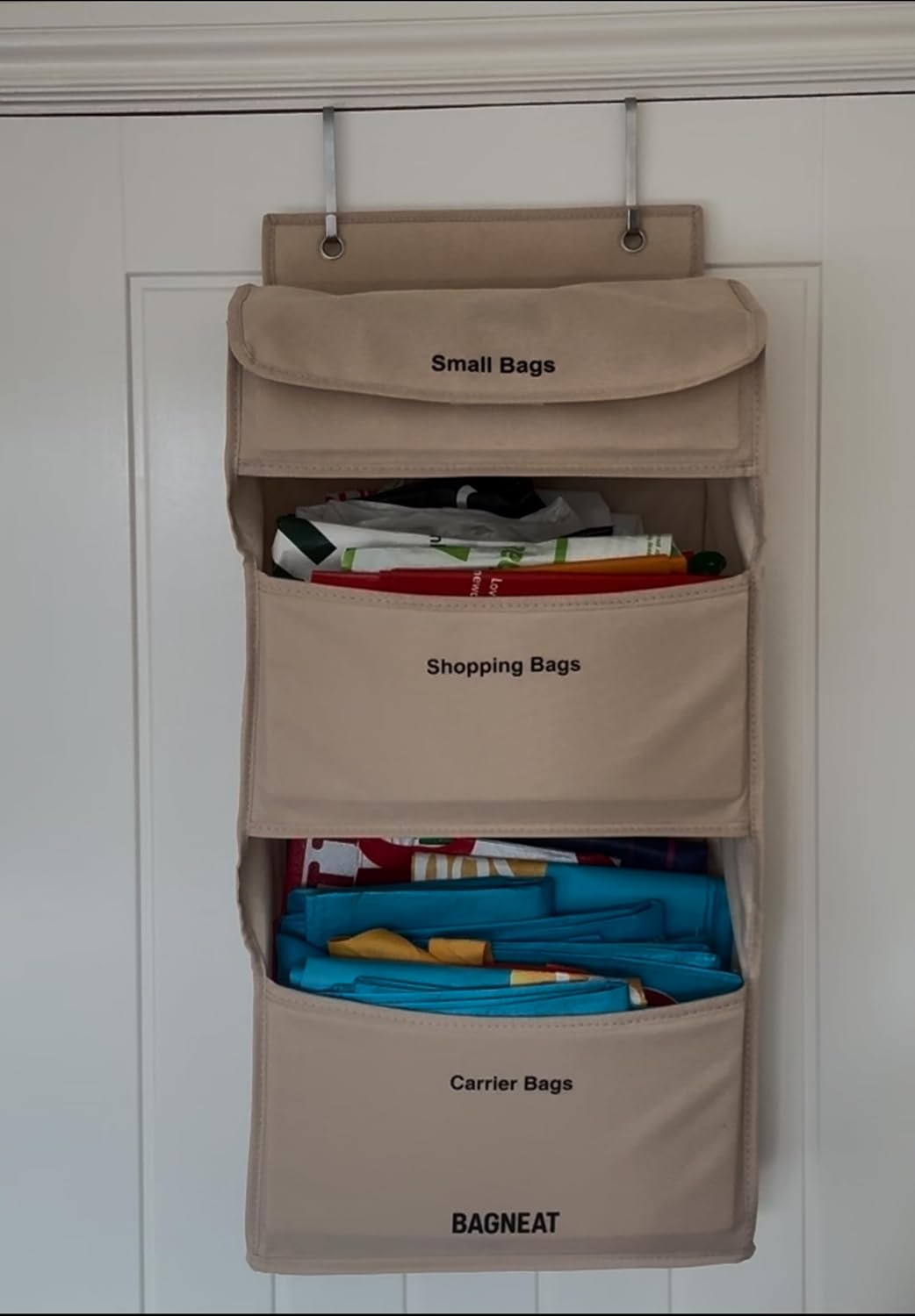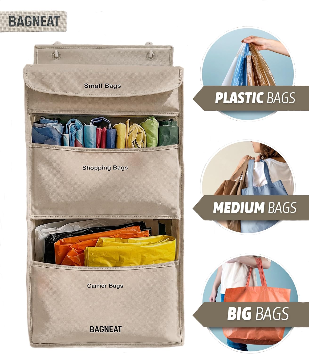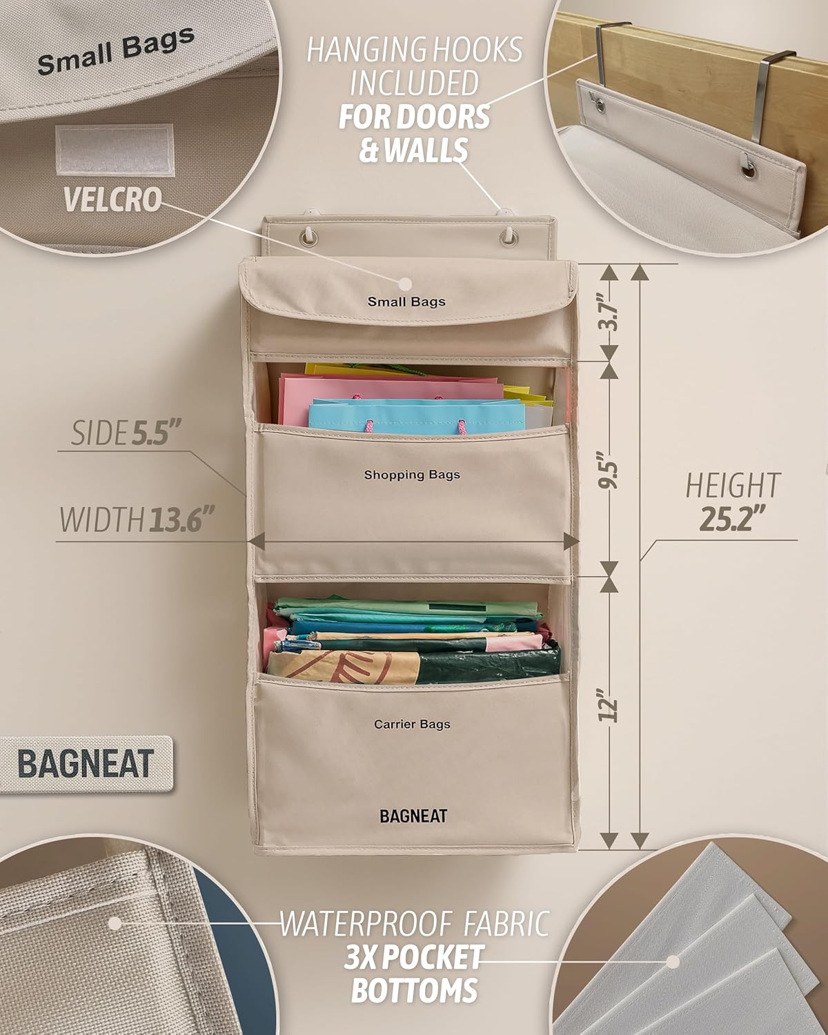 Keep your kitchen, pantry, and home organized with the BAGNEAT 3-in-1 Plastic Bag Holder & Organizer. Unlike ordinary plastic bag holders, BAGNEAT is the only grocery bag dispenser that separates your bags into three compartments: Small plastic bags on top Reusable bags in the middle Grocery carrier bags at the bottom No more cramming everything into one bin — this organizer makes it easy to reuse, recycle, and grab the right bag instantly. Quick & Flexible Installation: Use the included over-the-door metal hooks to hang on any standard interior door. The organizer can also be wall-mounted using appropriate screws or wall anchors suitable for your wall type. Hardware requirements may vary depending on the surface. Spacious Design: Measuring 27.6 tall x 13.8” wide x 5.9″ deep (70 x 35 x 15cm) this bag organizer can hold dozens of bags — plastic grocery bags, shopping bags, and reusable sacks. BAGNEAT helps you keep all your bags neatly sorted and easily accessible, reducing clutter and saving time whenever you need the right one. For wall installation, hardware suitability may vary depending on wall type. For drywall or hollow walls, appropriate wall anchors or screws are recommended.