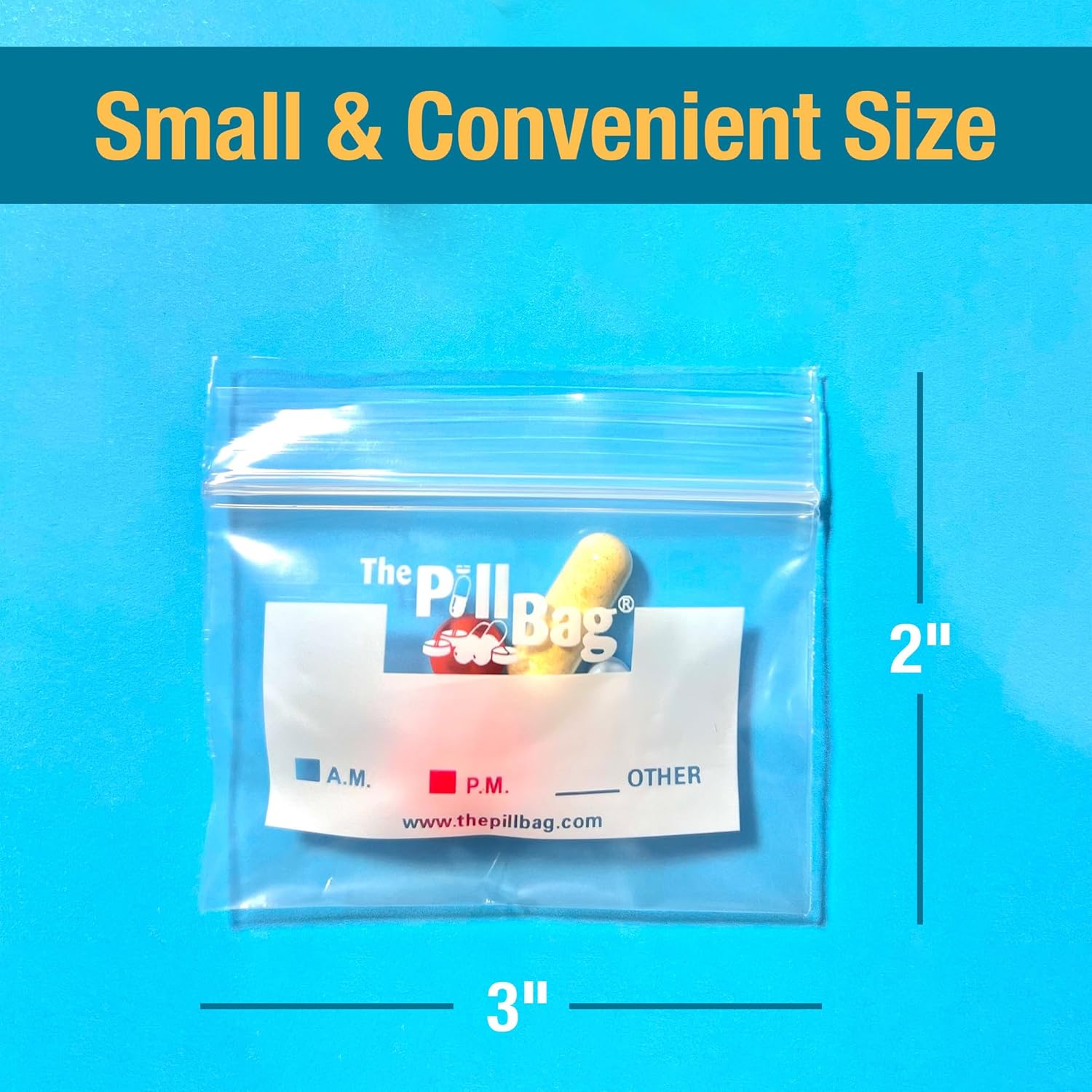 Introducing The Pill Bag, the ultimate pills organizer designed for convenience and durability. Made from 3mil, heavy-duty, moisture-resistant, low-density polyethylene (LDPE), this medicine pouch set is disposable, lightweight, and BPA Free ensuring safe storage for your pills, vitamins, and gummies. The pill baggies feature a zipper lock opening for easy access and a secure close, providing a reliable solution for medication management. Our travel medication organizer is versatile, serving as a daily pill organizer 2 times a day, a weekly pill organizer, or even a monthly pill organizer based on your needs. It’s not only an efficient pill dispenser but also a medicine travel organizer for your trips. The compact pill organizer fits easily into your pocket, purse, or bag, making it the perfect travel medicine kit. The Pill Bag is an ideal choice for everyone from travelers to elderly individuals who need an AM PM pill organizer. Even kids find this cute pill organizer easy to use. It’s a perfect pill carrier for family members who need to manage medications during travel, and great to use at sleepaway camp. The Pill Bag is more than just a pill container; it’s a comprehensive medicine organizer. It can also serve as a vitamin dispenser organizer or a pill tracker, perfect for those who need a pill organizer 2 times a day or a pill organizer 3x a day. The pill pouches are resealable, ensuring your medicine stays fresh and secure. Durable, smellproof and water resistant The Pill Bag is a medicine bag for traveling, a daily vitamin organizer, and a pill organizer for travel. It’s the ideal solution for your medication and vitamin storage needs. With The Pill Bag, you can easily organize and carry your pills, whether you need a travel pill case, a pill box for your purse, or a pill organizer with labels. Get your Pill Bag today, and make your medication management stress-free and straightforward