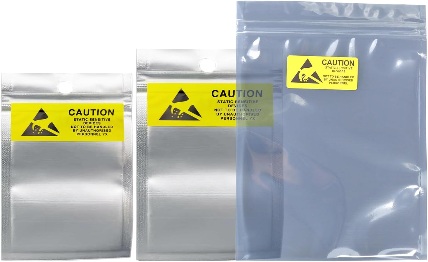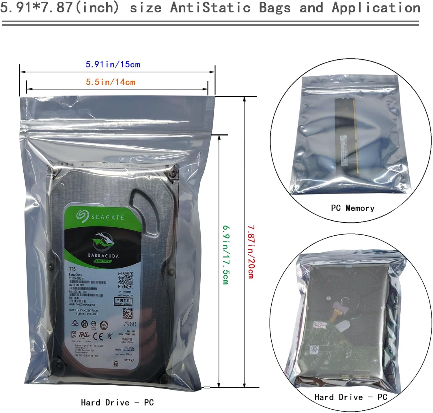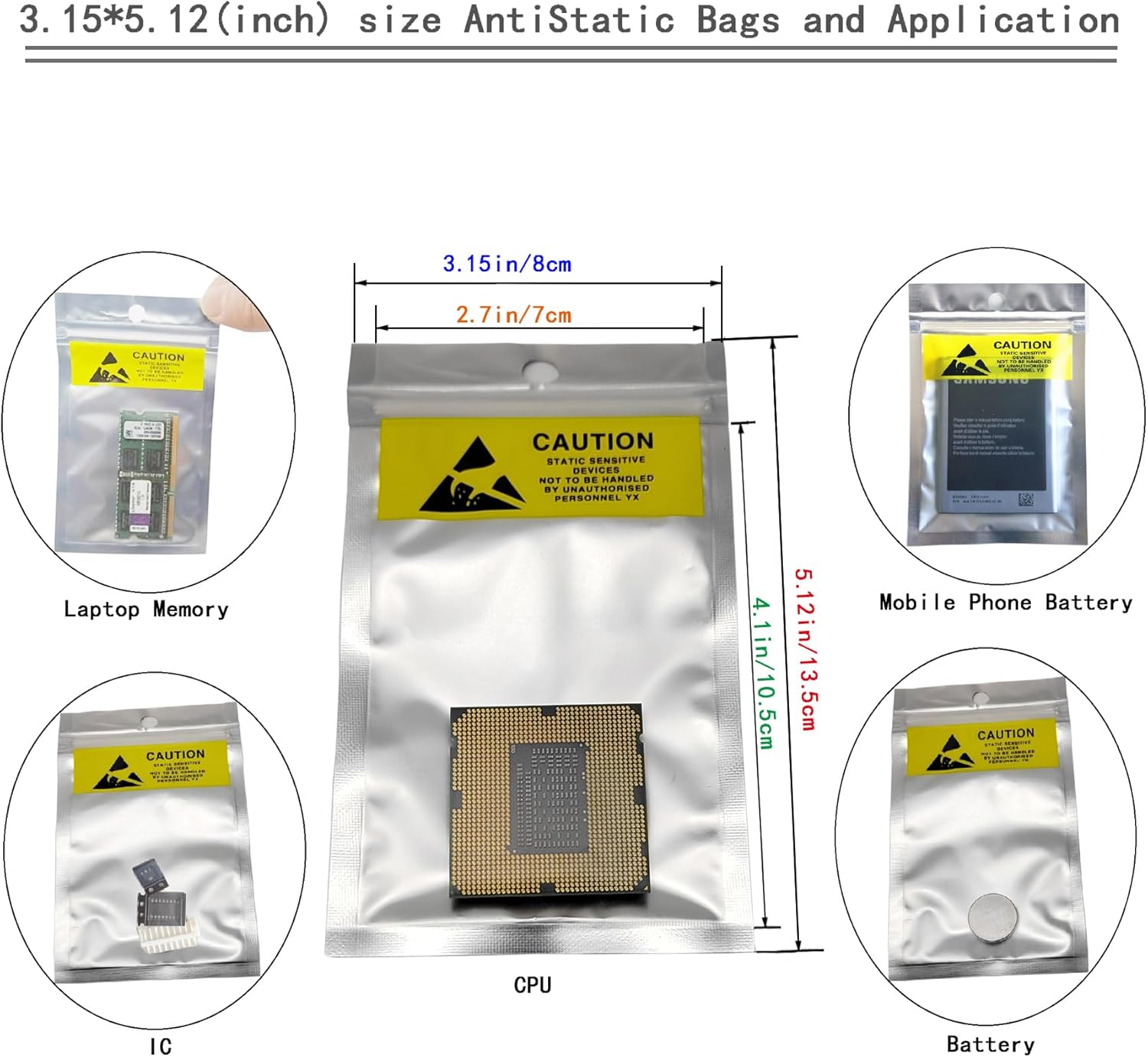 Quantity and Specifications:12Pcs (3.15×5.12inches/8x13cm) and 12Pcs(3.94×5.91 inches/10X15cm) and 12Pcs (5.91*7.87in/15*20cm) anti static bags.