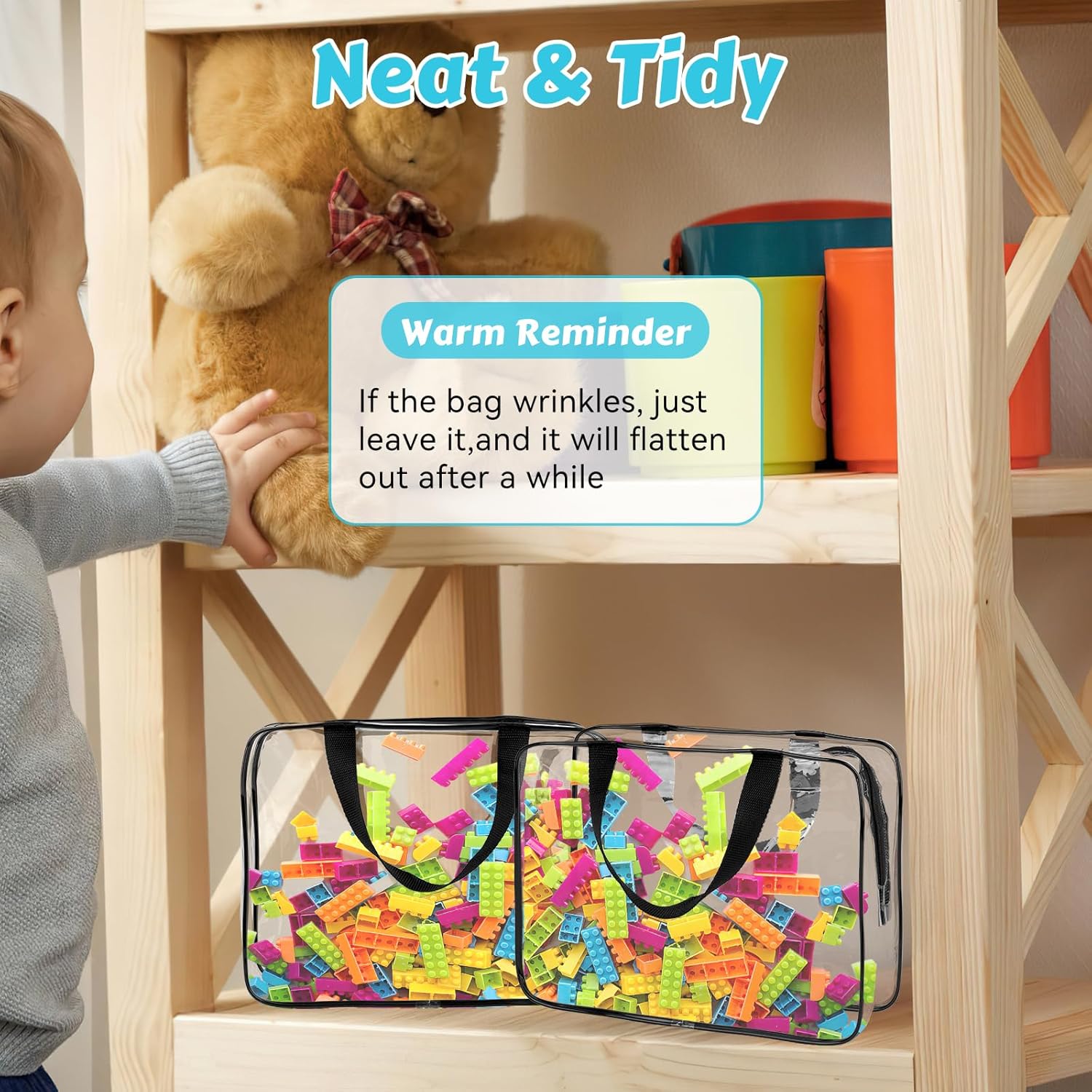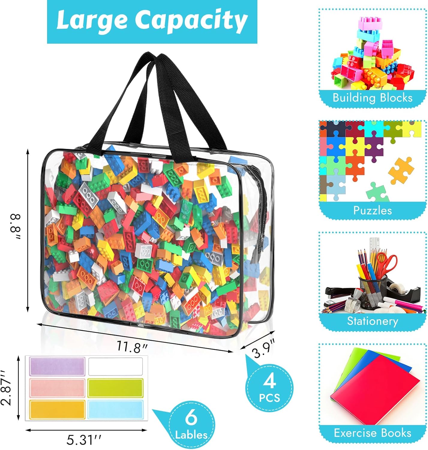 4 Pack Toy Storage Bags, Clear PVC Toy Organizer with Zipper, Large Black Waterproof Reusable Toy Bags with Labels for Puzzles, Building Blocks, Board Game, Stationery, Kids Books