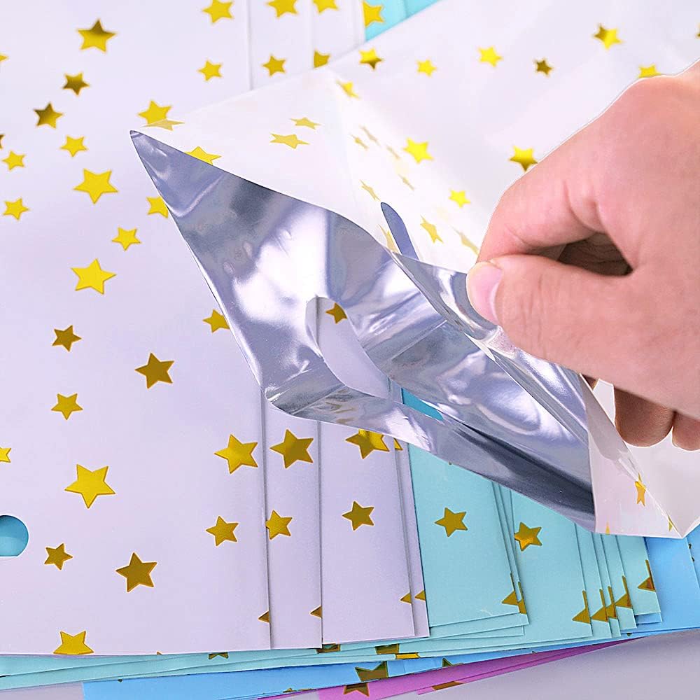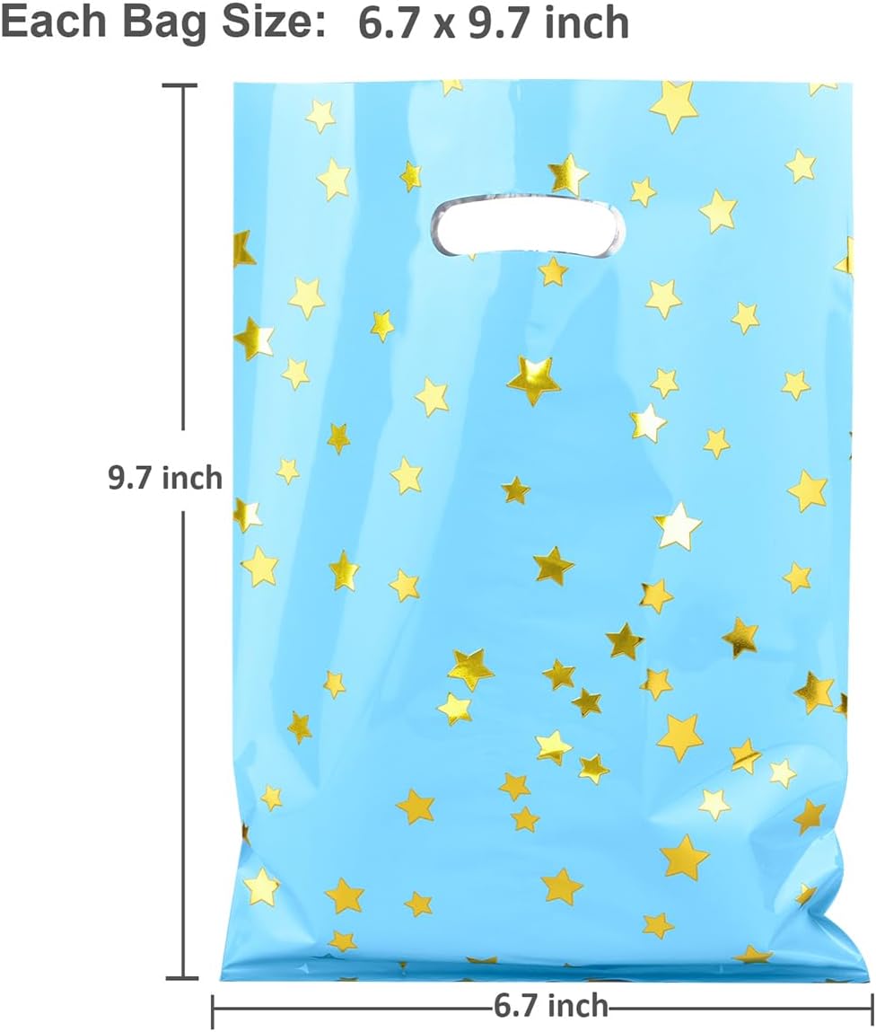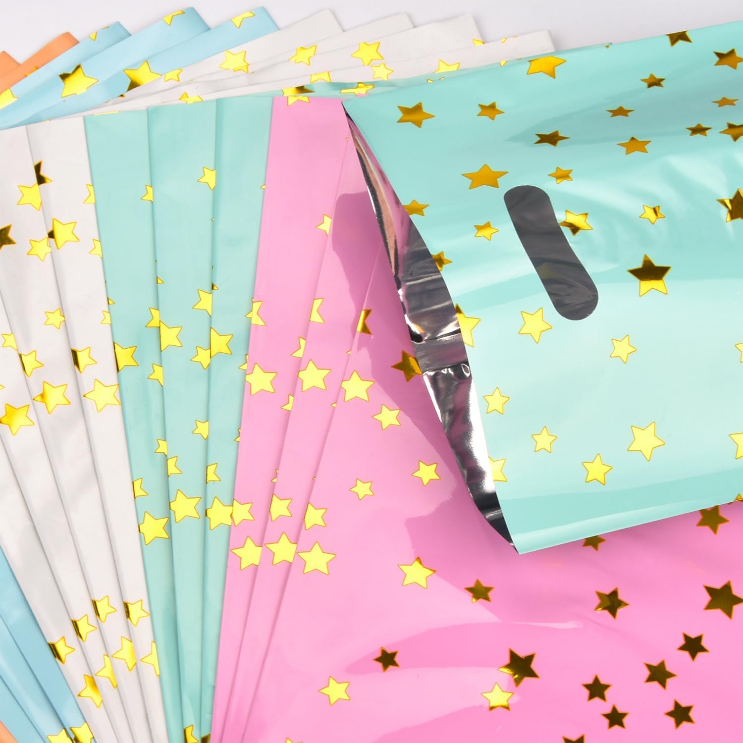 The plastic party present bags are printed with golden stars and pastel colors design, which will be enjoyable party supplies for little ones’ birthday, baby shower, Christmas, New Years, graduations