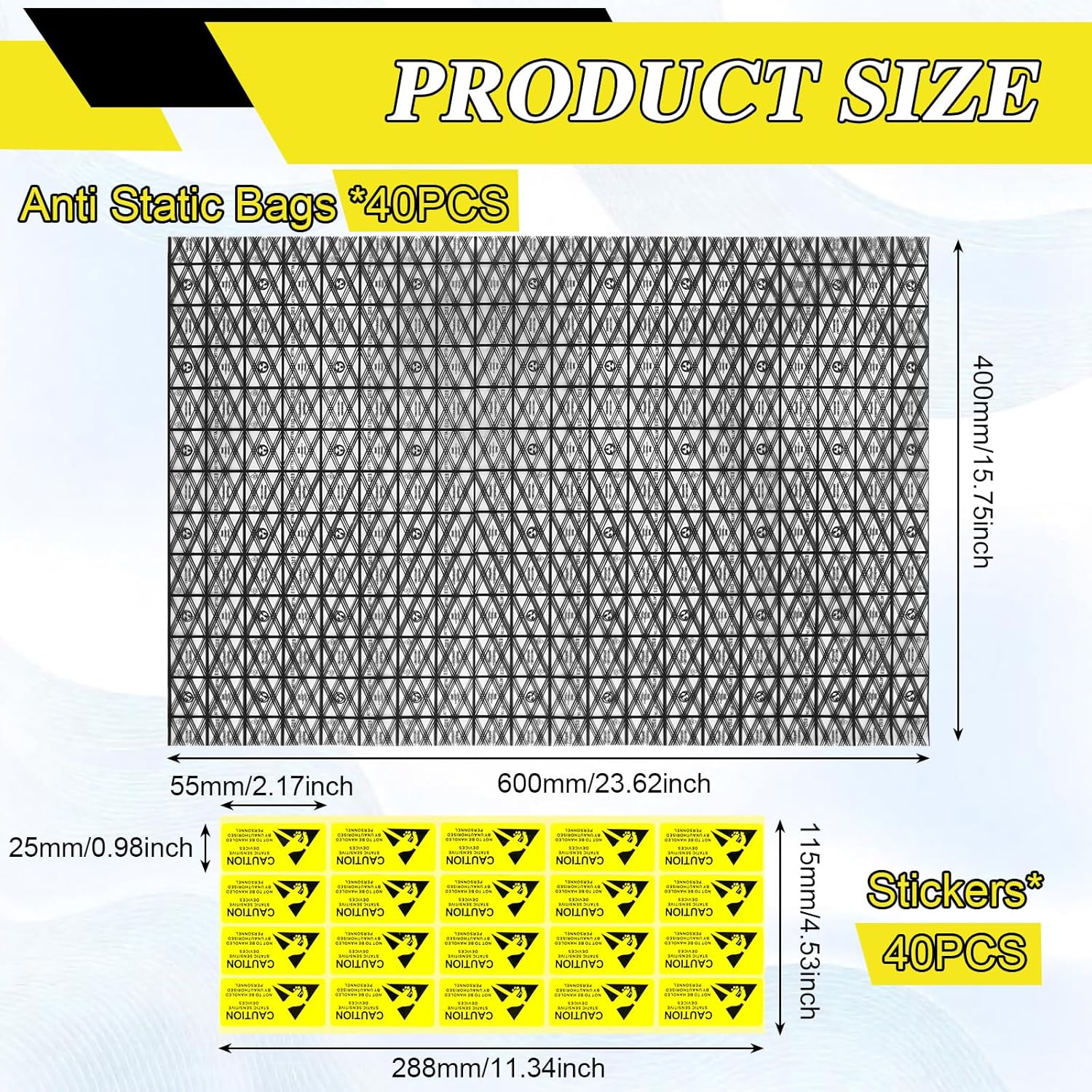 Package Includes:The Package includes 40 large ESD anti-static bags with 40 anti-static labels.These shielding antistatic bags provide reliable protection for sensitive electronics like motherboards video cards and hard drive.