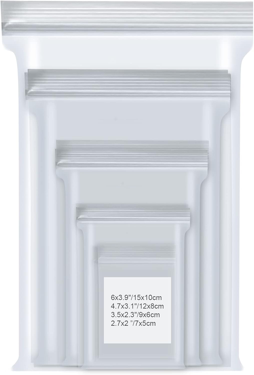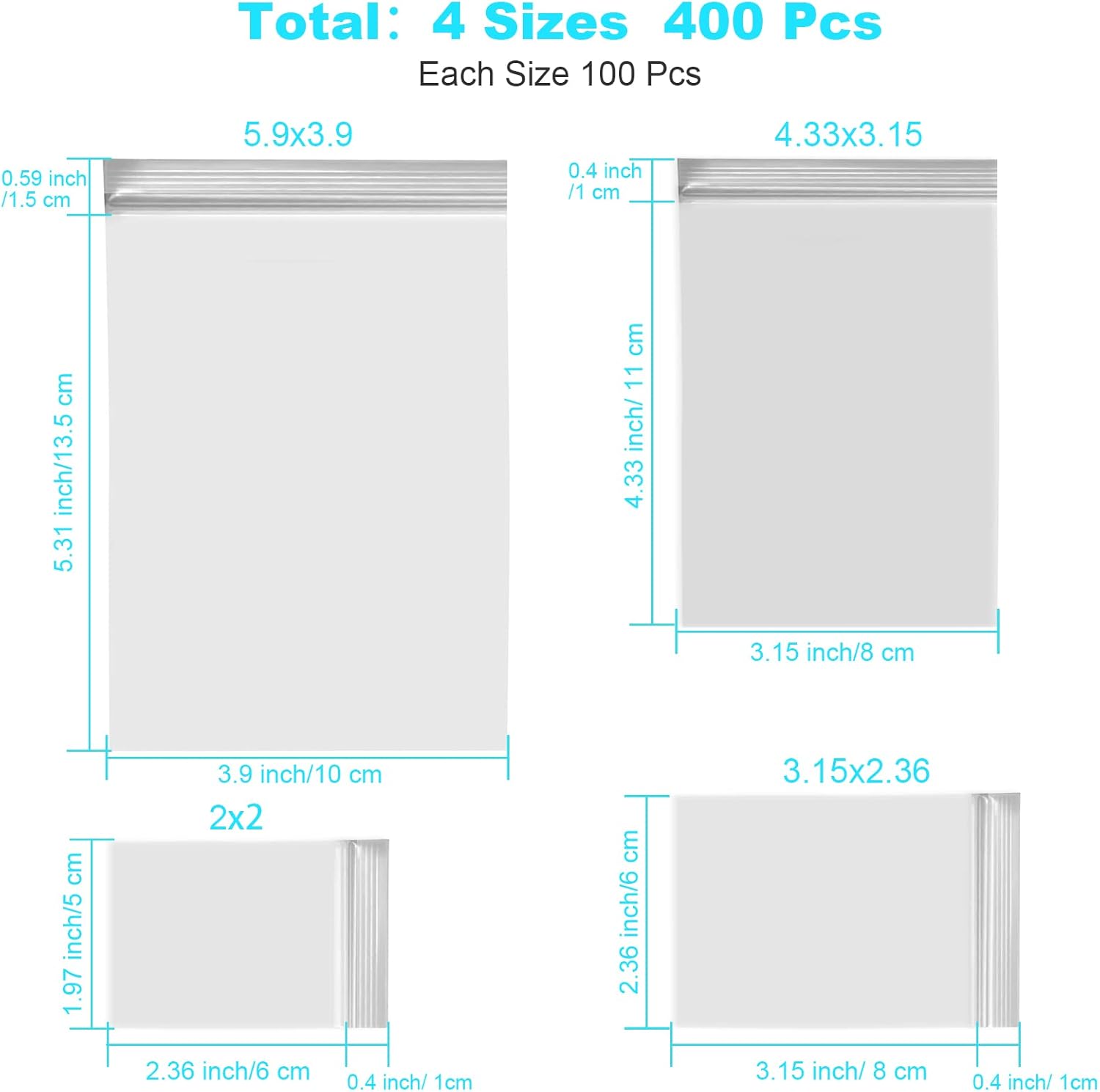 Assorted: 4 assorted different sizes: 6 x 4 inches/15 x 10 cm, 4.7 x 3.1 inches/12 x 8 cm, 3.5 x 2.4 inches/9 x 6 cm, 2.7 x 2 inches/7 x 5 cm, 100 pcs for one size, total 400 pcs zipper bags for jewelry pill packaging snack!