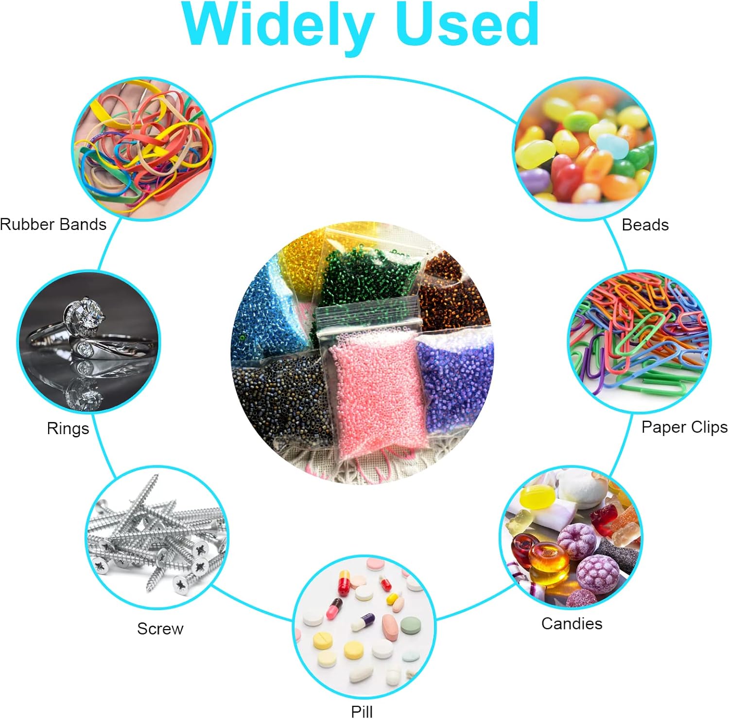 Our 4 assorted different sizes bags each size 100 pcs resealable clear jewelry bags can be used as jewelry bags, pill bags, packaging bags, snack baggies, little pills baggies, business bags, food storage bags, candy bags, coin bags, beads bag, grocery bags, etc! Our small baggies set meet all your packaging needs!