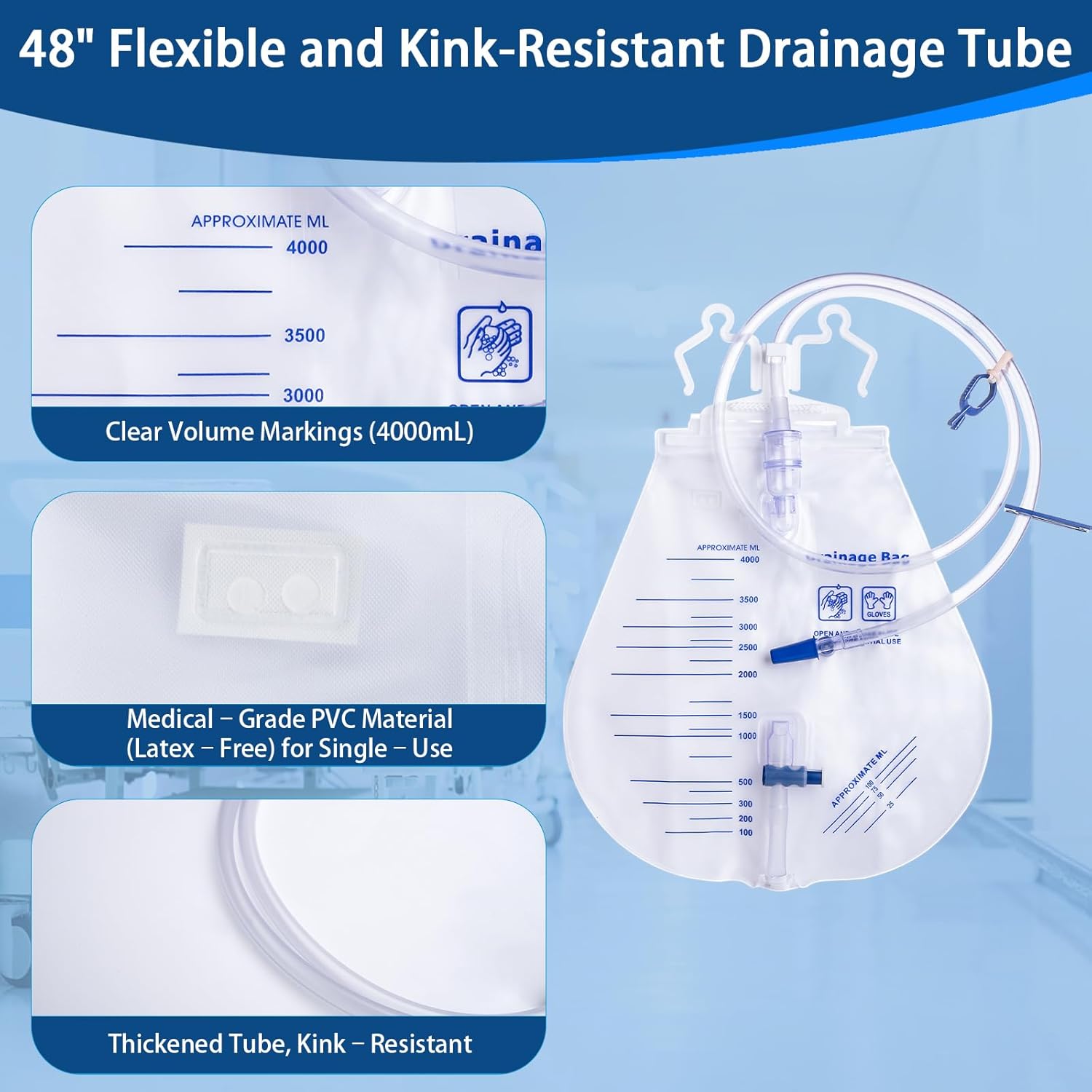 Designed for Extended Care:4000mL/135oz capacity urinary drainage bag reduces replacement frequency to save your cleaning time. For postoperative patients, those with incontinence, and anyone requiring convenient urine management, ideal for bedridden patients, hospital stays, and overnight use for incontinence care