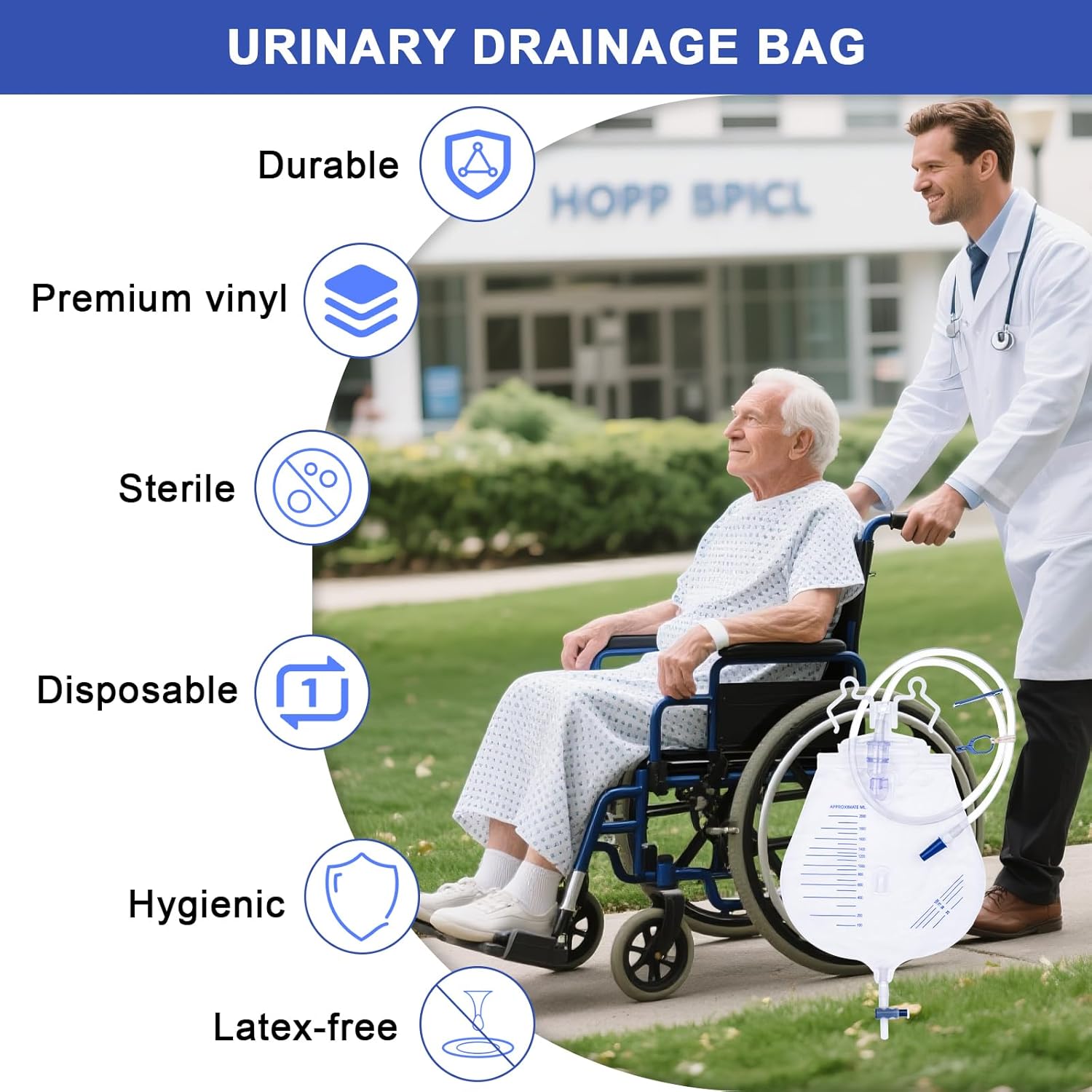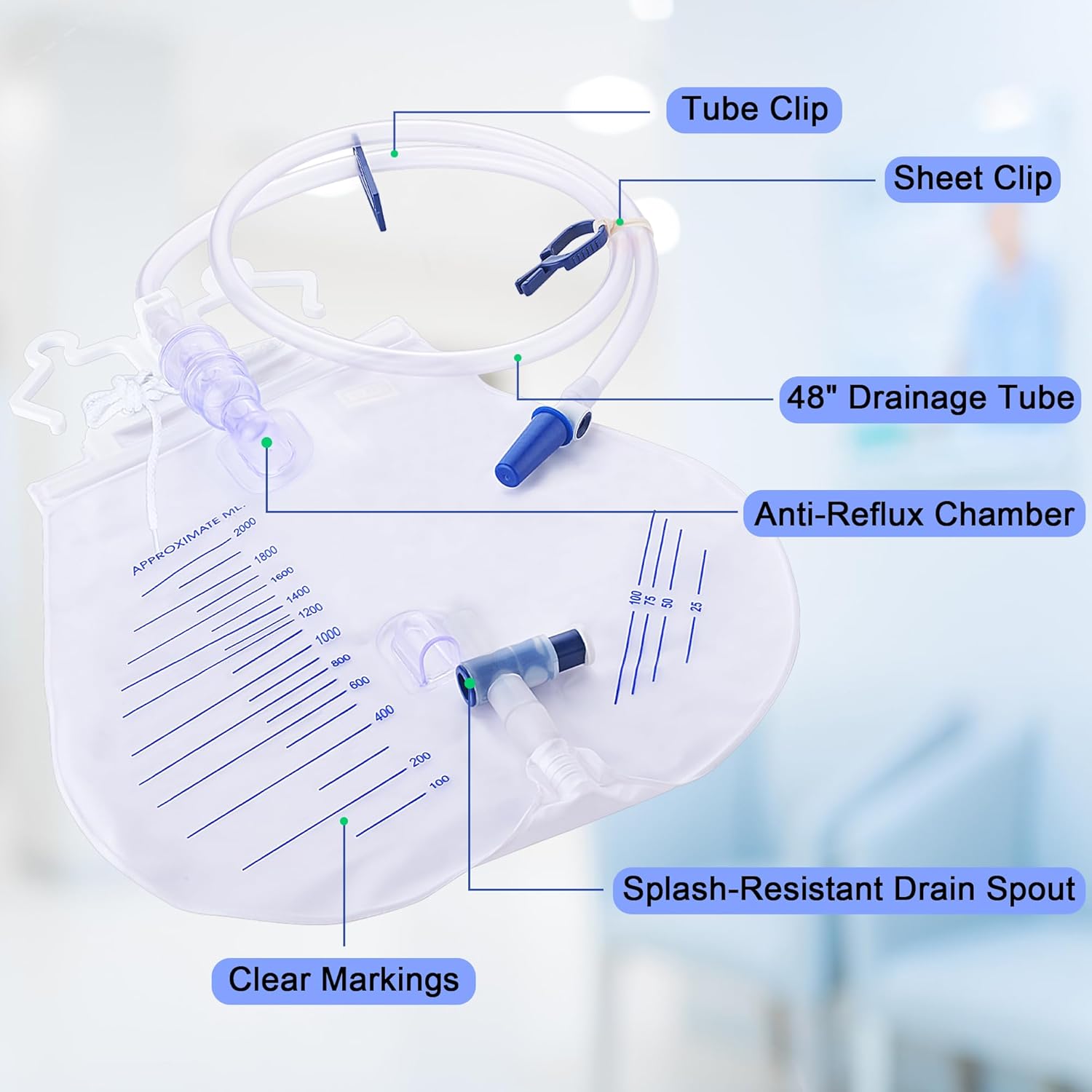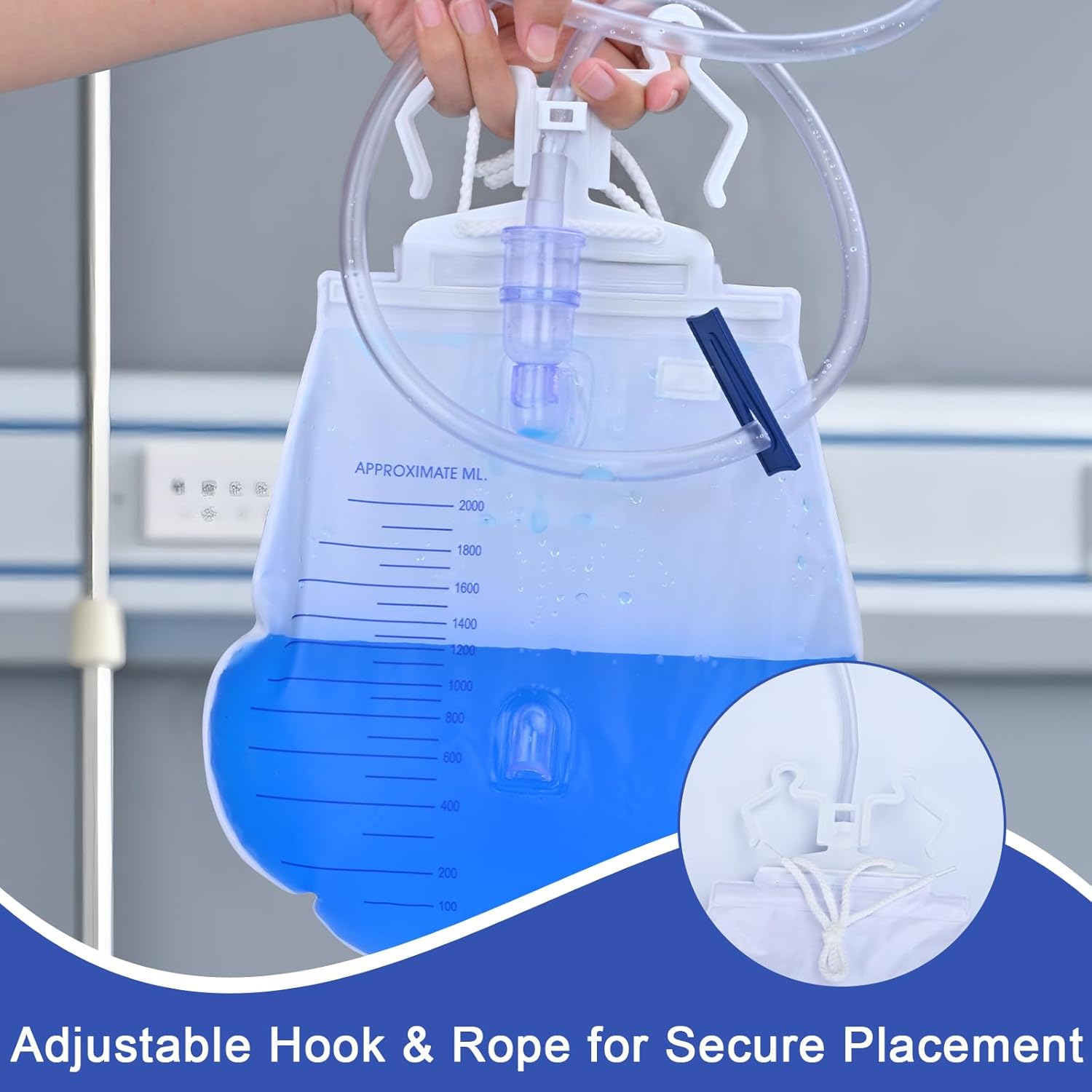 User-Friendly: Clear graduation marks, one-hand operable drain valve, Versatile hook, clip, and adjustable strap stay firmly attached to bed, wheelchair or sheet during movement.