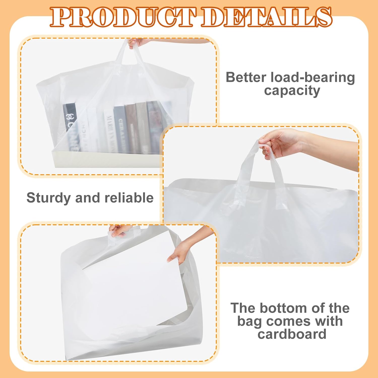 Durability That Doesn’t Compromise on Style: our plastic shopping bags are as stylish as they are sturdy; White plastic bags with soft loop handle allows easy carry and reinforced cardboard bottoms for easy stand up