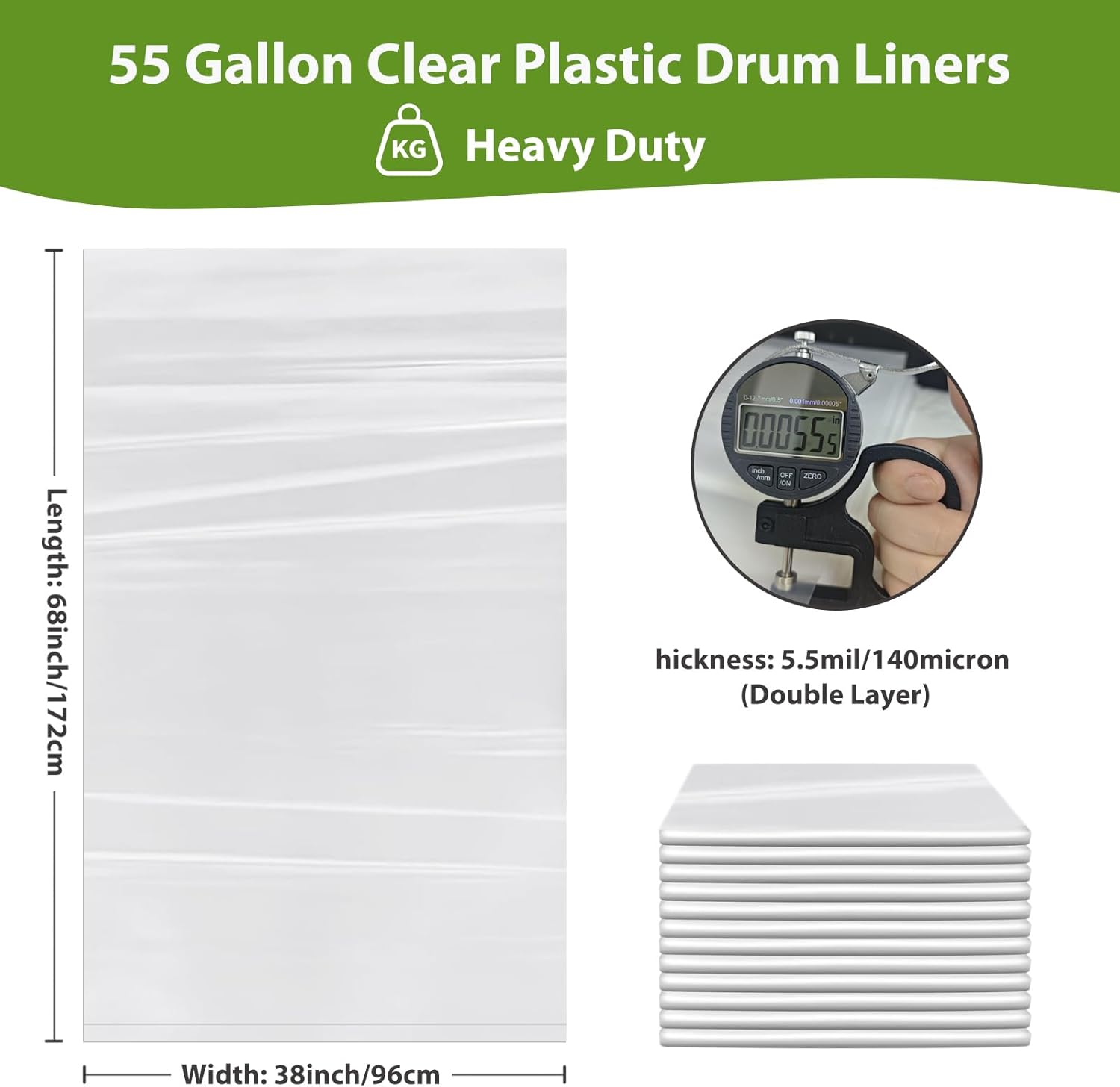 These 55-gallon clear plastic drum liners offer a versatile storage solution for various indoor and outdoor needs. With their food-grade material and double-layer thickness, they provide a durable and leak-proof option for storing and containing items. Whether you need them for marinating, brining, or heavy-duty waste disposal, these liners are designed to meet your requirements.