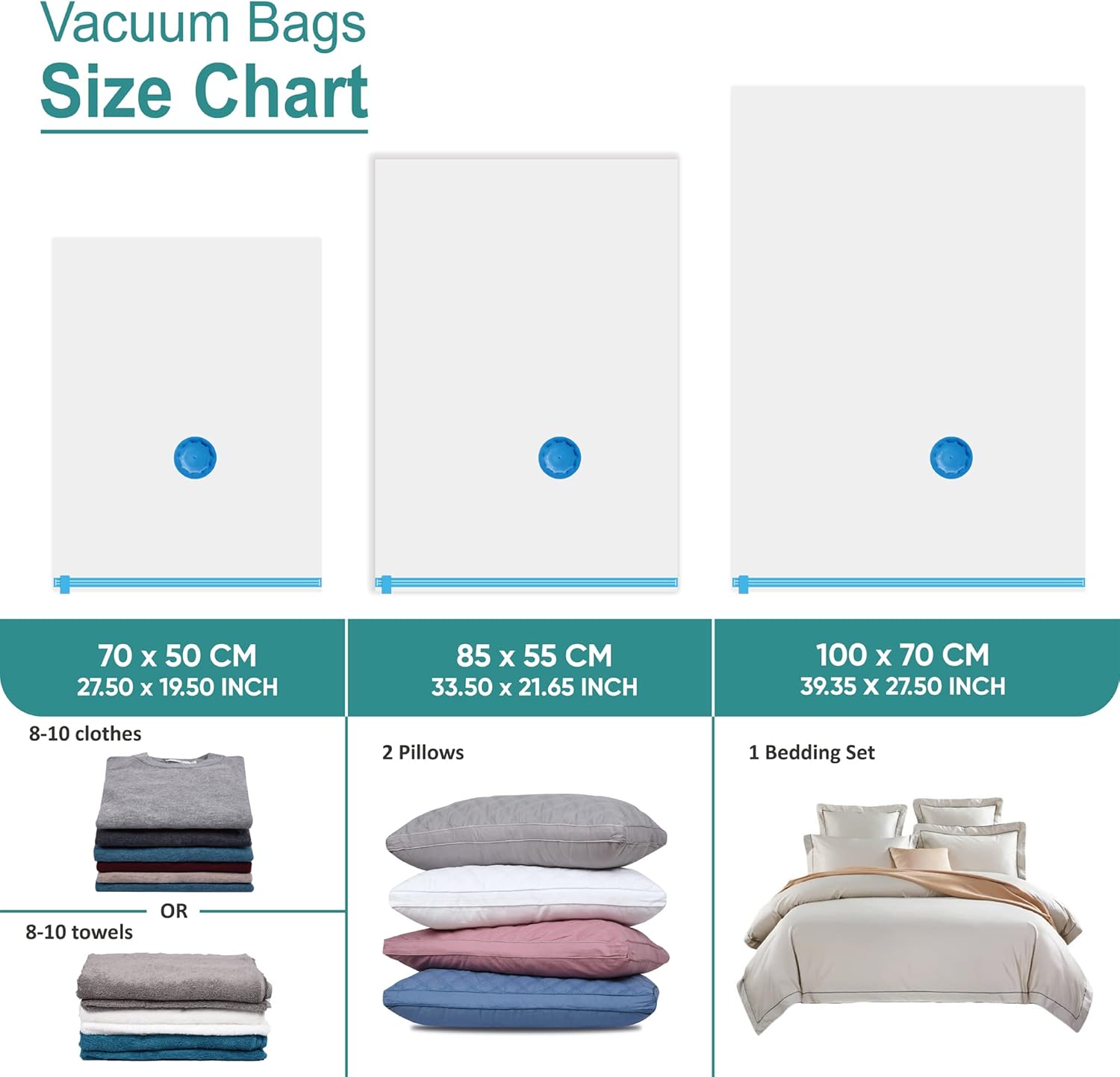 6 combo includes: 2 jumbo bags (39.4 x 27.5 in) fitting 1 bedding set; 2 large bags (33.5 x 21.7 in) fitting 2 pillows; 2 medium bags (27.5 x19.5 in) fitting 8-10 clothes/towels.