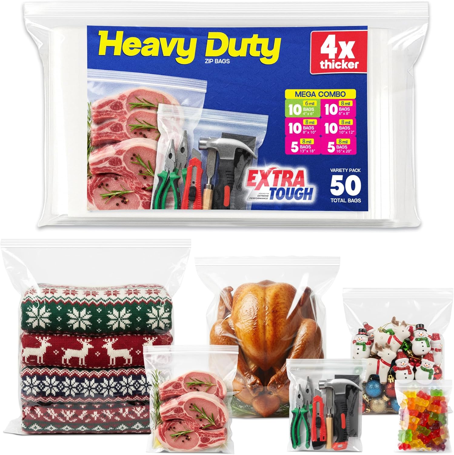 6 Sizes Heavy Duty Zip Seal Lock Snack Sandwich Gallon Storage Bag Variety Pack, Multiple Sizes 6–8 Mil Thick Zipper Top, Freezer Bags, 50 Count