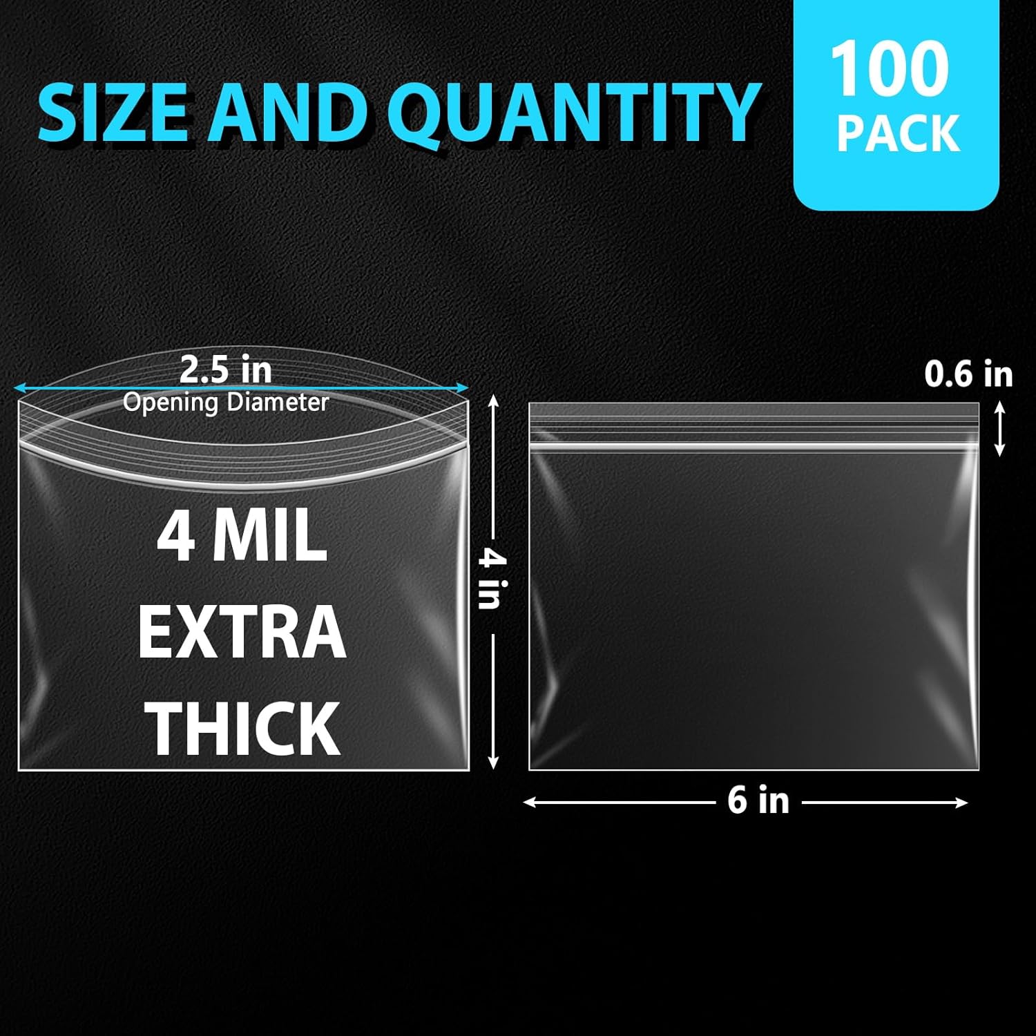 BAG SIZE: measures 6″ Wide x 4″ High (15.24 CM x 10.2 CM) below the zipper. Thickness: 4mil. Quantity: 100 PCS.