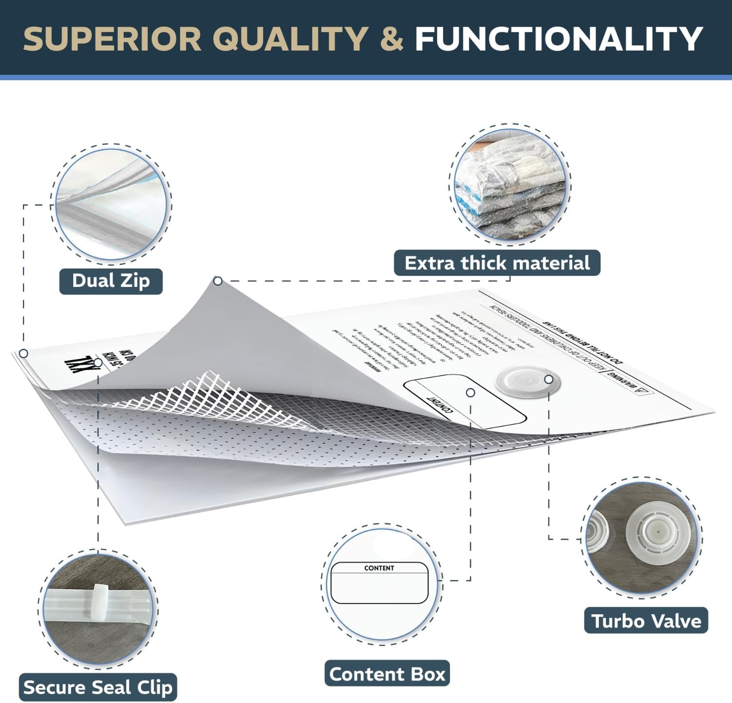 DURABLE AND REUSABLE: Constructed from high-quality, extra-strong PA+PE material, our extra large and jumbo space saver bags feature a double zipper and triple-seal valve, ensuring 100% protection against dust, dirt, bugs, moisture and odors. Designed for repeated use, our bags are built to last.