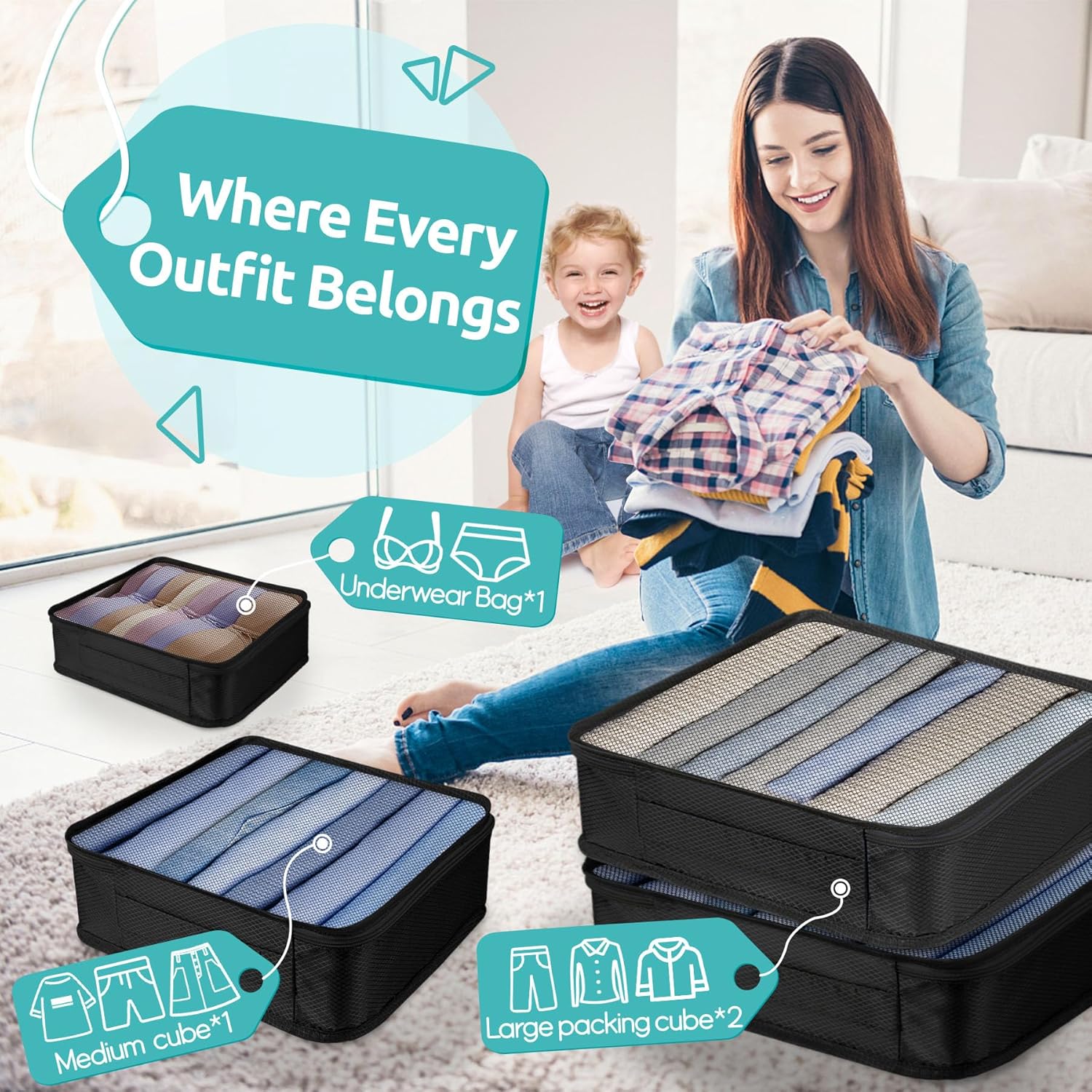 12-piece All-in-One Travel Packing Cubes Set: When your luggage’s calm, so are you. Our 12-piece set has 4 clothing cubes, 3 zip pouches, 3 waterproof bags, and 2 shoe bags—everything in its place.Open your suitcase and start your trip neat and stress-free