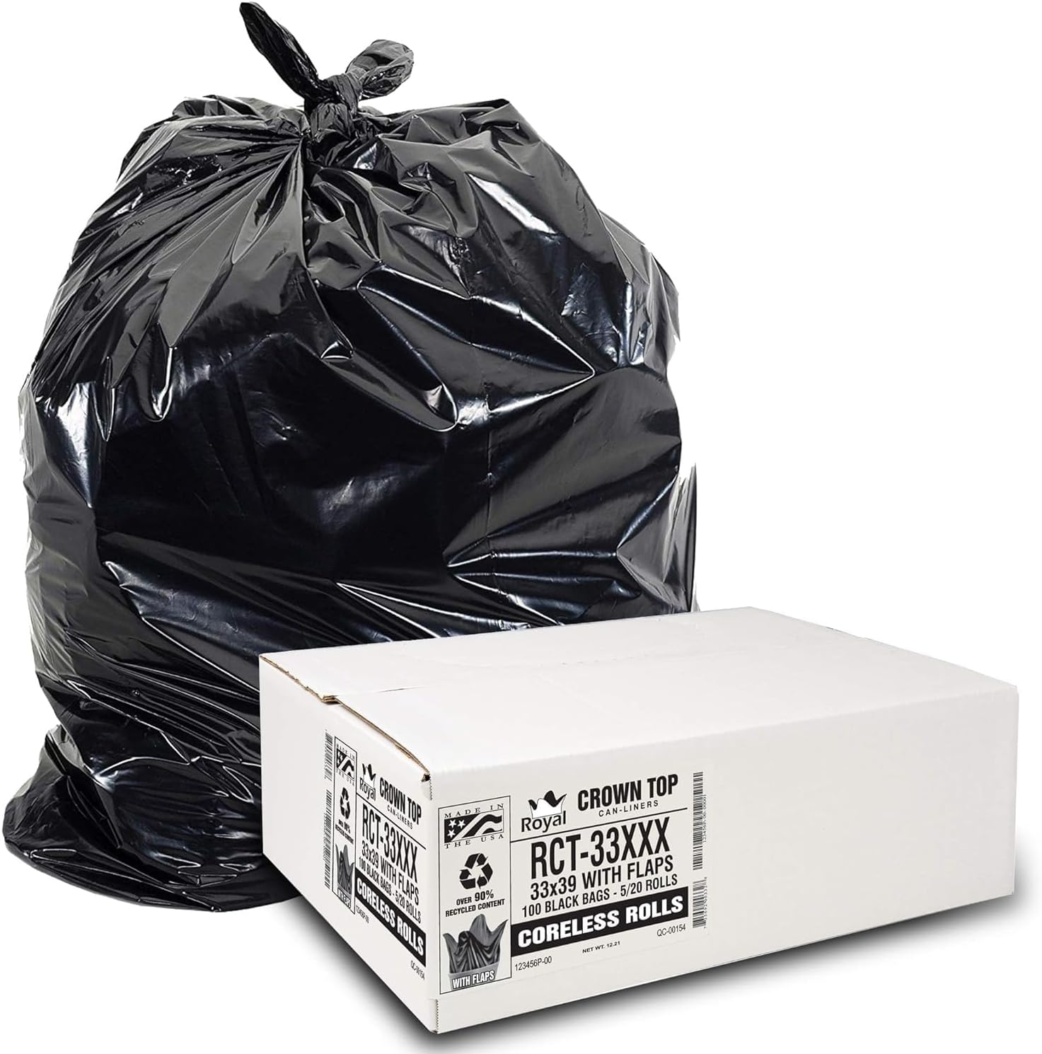 RCT-33XXX Premium Metallocene Blend Low Density Trash Bag. Royal Crown Top (RCT) with EZ tie Flaps is our preferred trash bag. Great for the office, kitchen, and yard. Superior stretch, Extra Elongation and puncture resistance.