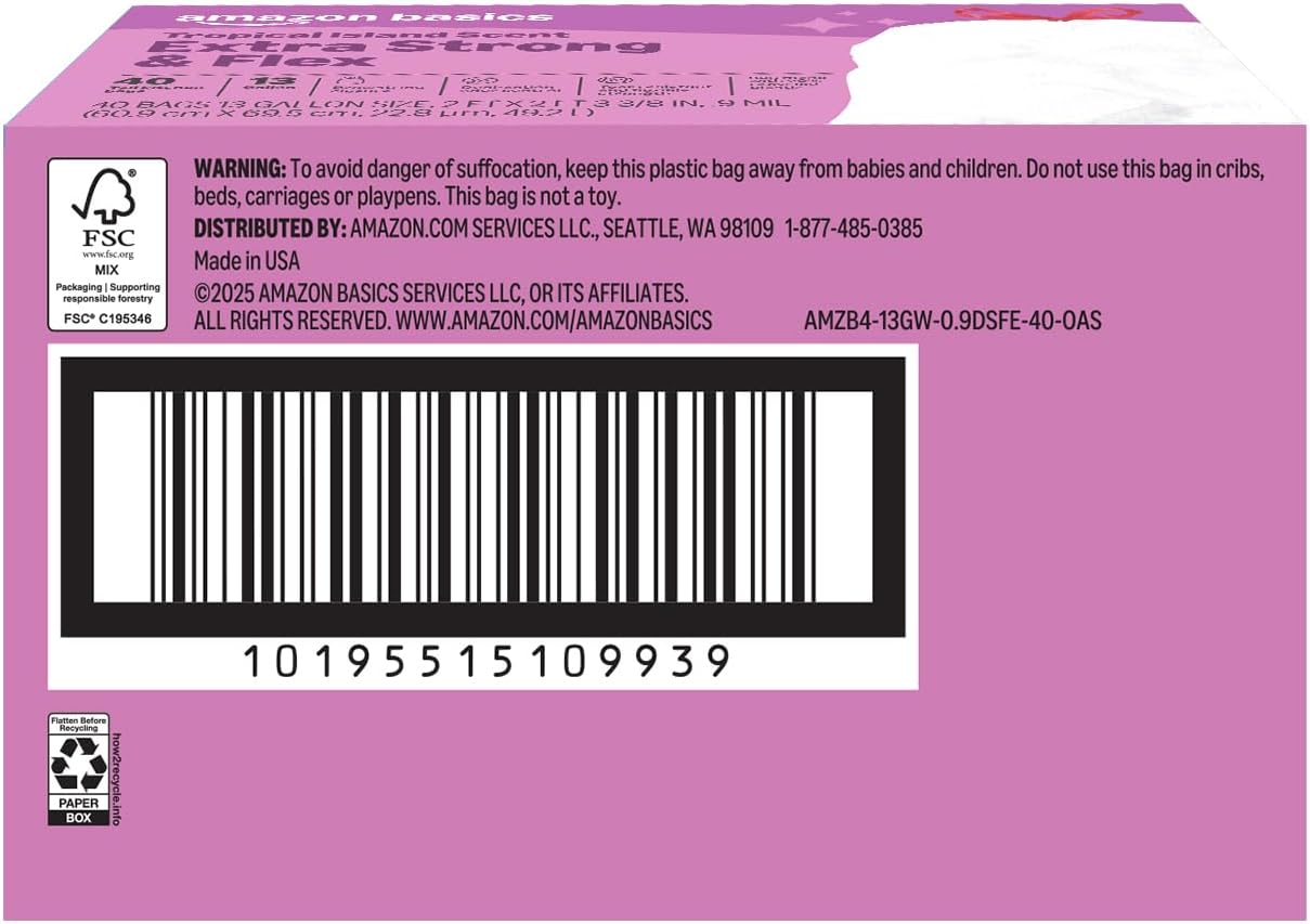 Amazon Basics Extra Strong & Flex Tall Kitchen Drawstring Trash Bags, Tropical Island Scent, 13 Gallon, 40 Count