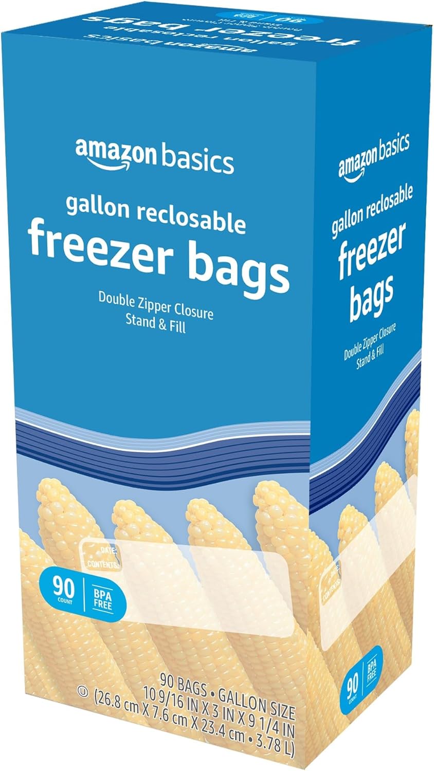 Amazon Basics Freezer Gallon Bags, 90 Count, Reclosable top has a double zipper closure. Stand and Fill base with same gallon capacity