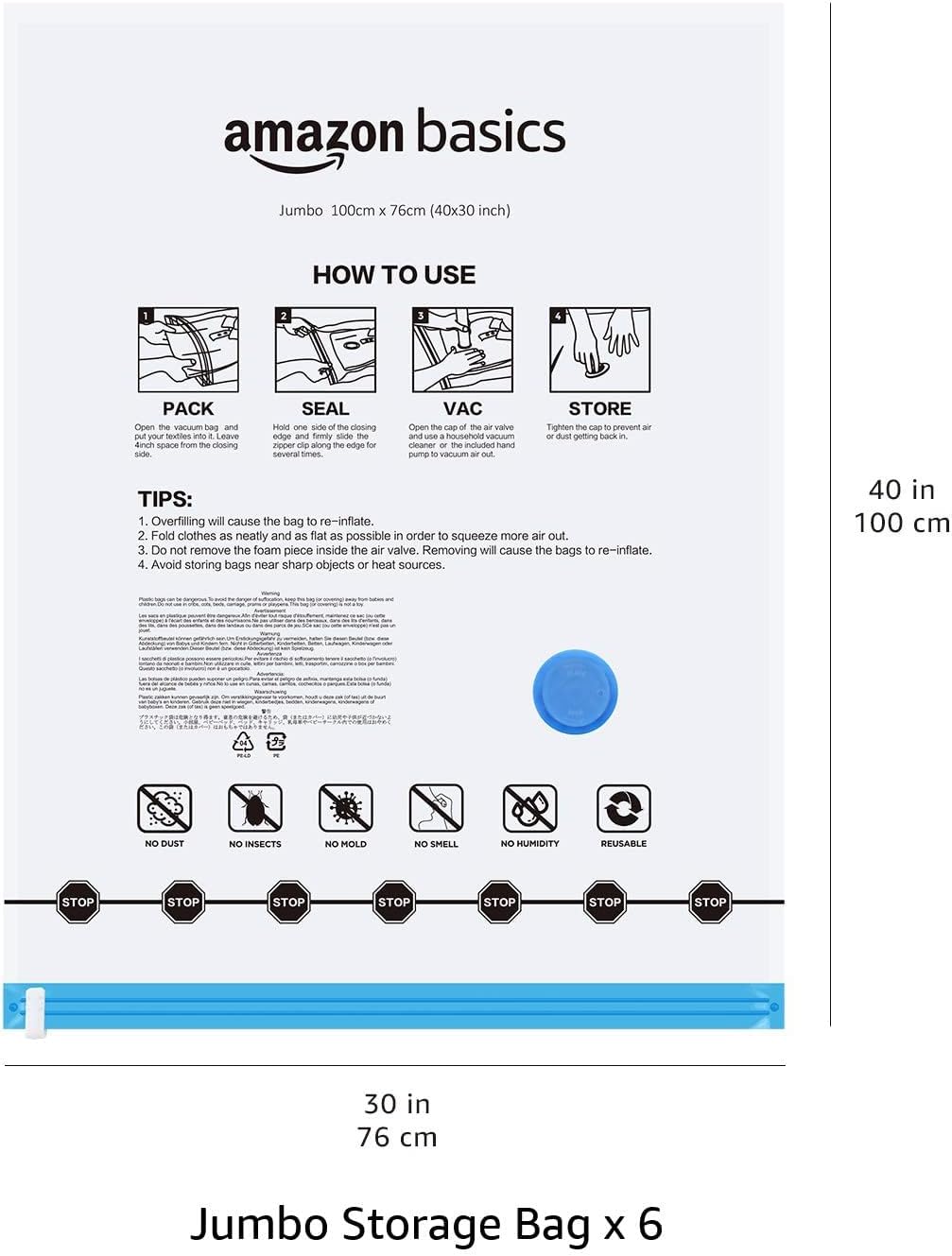 Amazon Basics Vacuum Storage Bags for Clothes, Space Saving Compression Storage Bags with Hand Pump, Heavy Duty, Stackable, Jumbo Size, Clear, 6-Pack