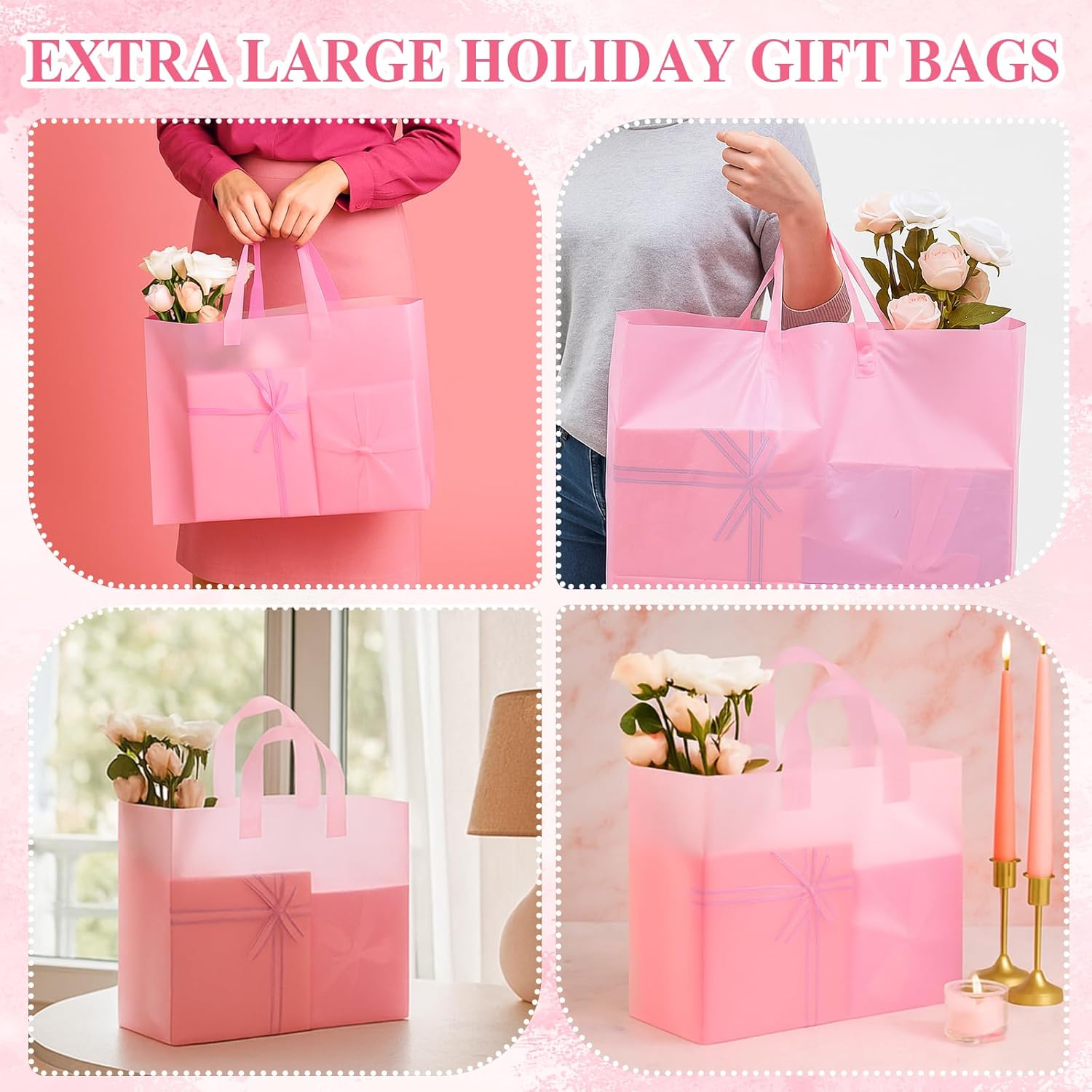 Large Size: the plastic gift bags with handles are about 16 x 12 x 6 inches, which can easily hold the gifts, goods you want to hold, you will be satisfied by our products and you can share shopping plastic bags with others
