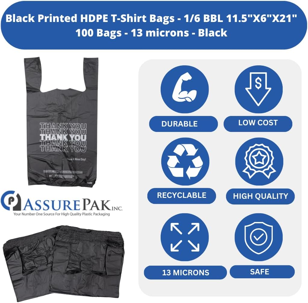 ASSUREPAK Easy Open – 100 Bags – Black Printed HDPE T-Shirt Bags – 1/6 BBL 11.5″X6″X21″ – 13 microns – Black – Thank You Shopping Bags for Retail, Takeout, Restaurant Supplies – 208015STY-EO