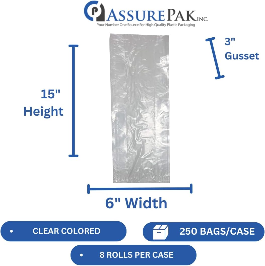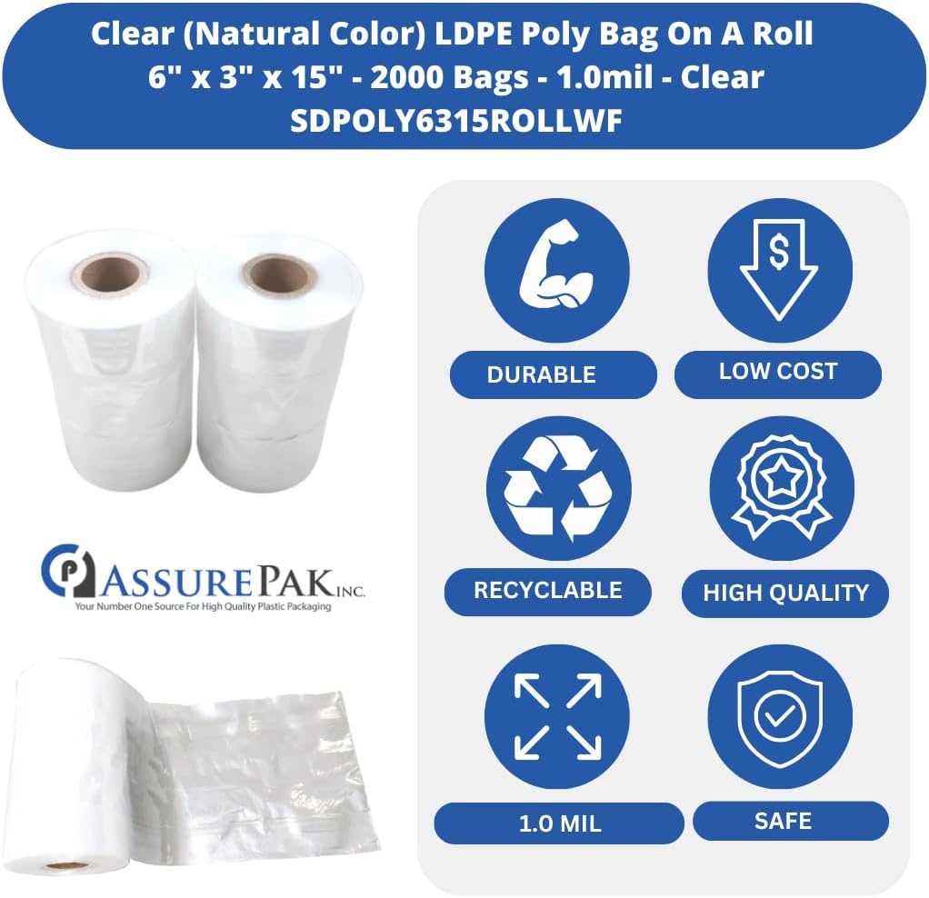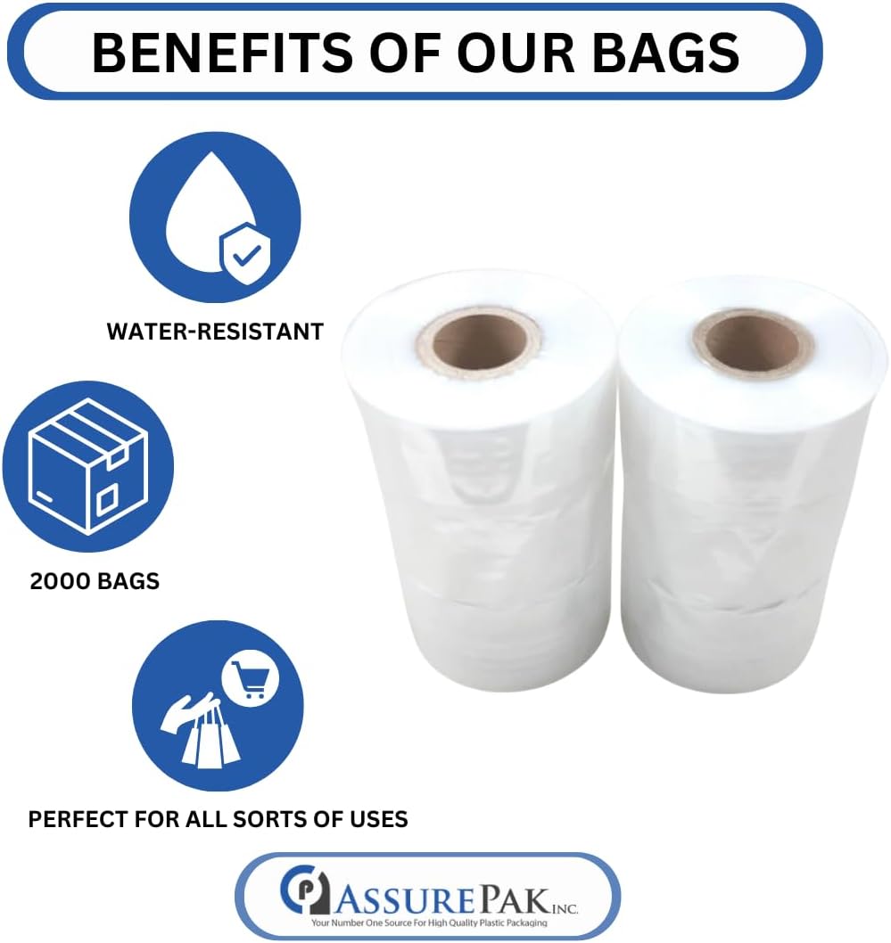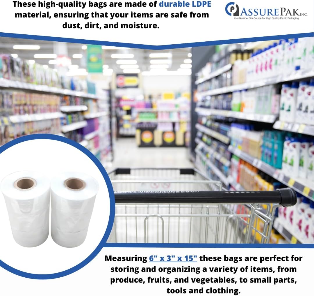 ASSUREPAK LDPE Clear Poly Bags on a Roll – 6″x3″x15″ – 2000 bags – Ideal for Food Storage: Meat, Beans, Cookies, Bakery, Grocery Needs, and Small Business Packaging