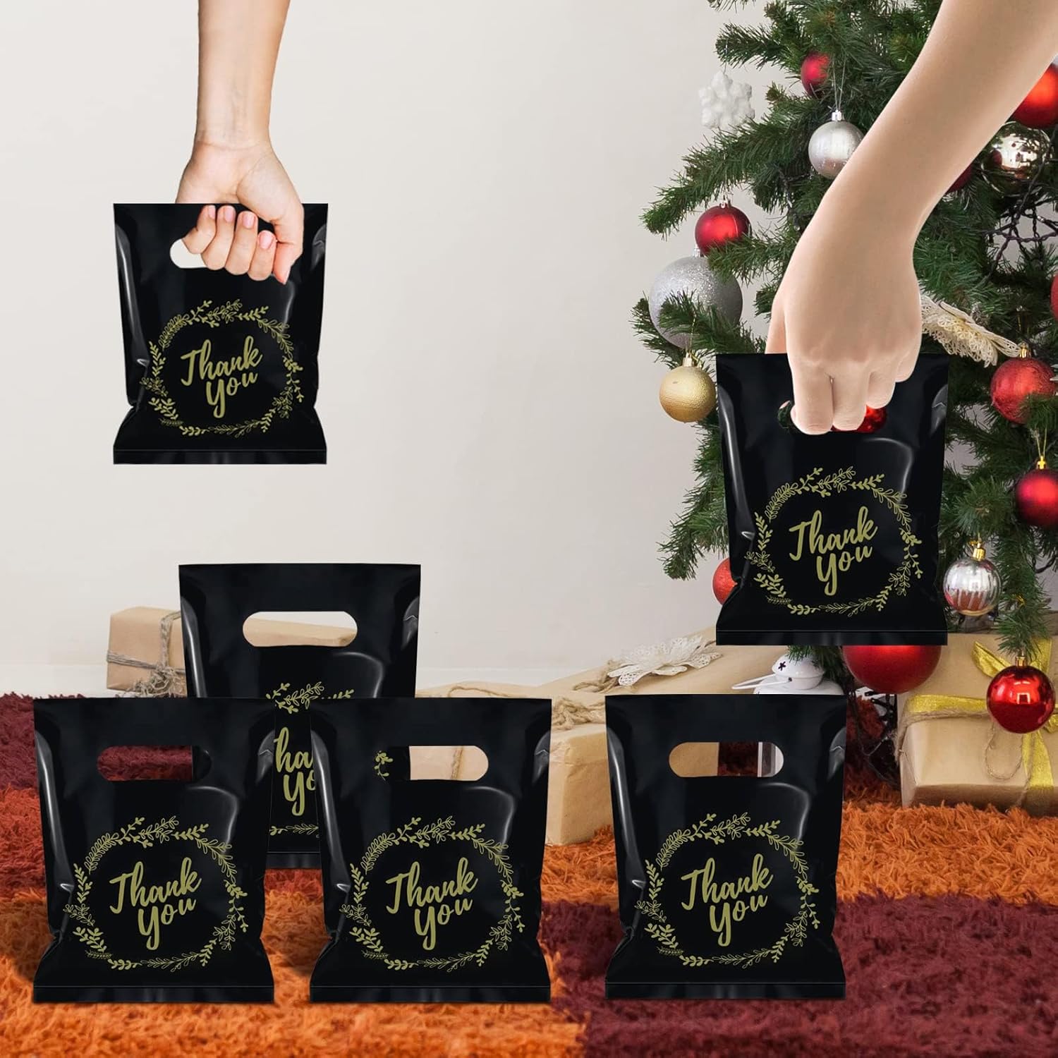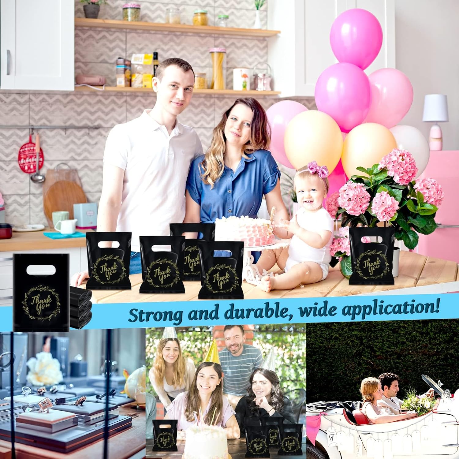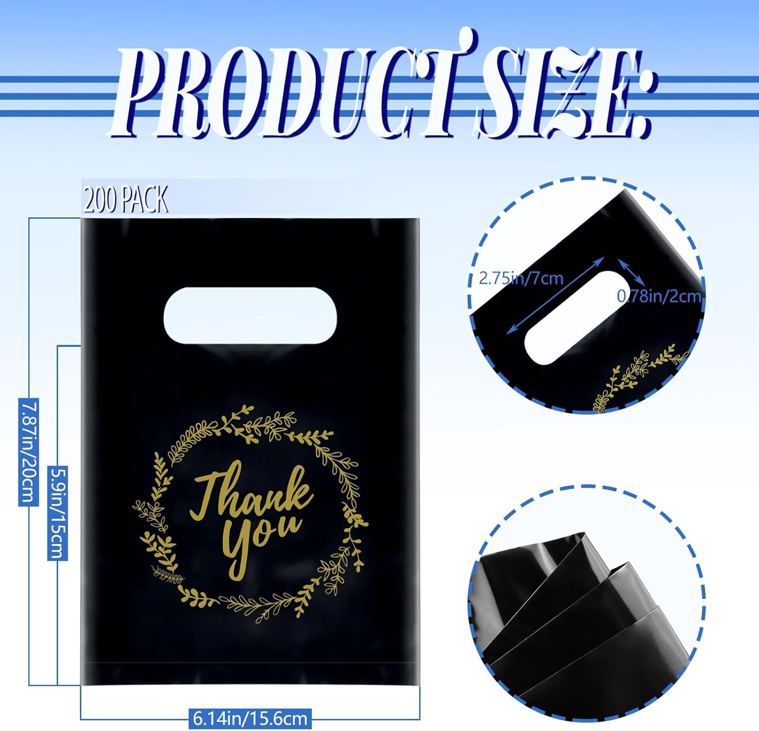 Material: our small shopping bags are made of high quality plastic, printed with golden thankyou pattern, soft, stretchy, reusable, not easy to break and fade. each bag comes with a pre-cut handle and a golden thank you lace pattern