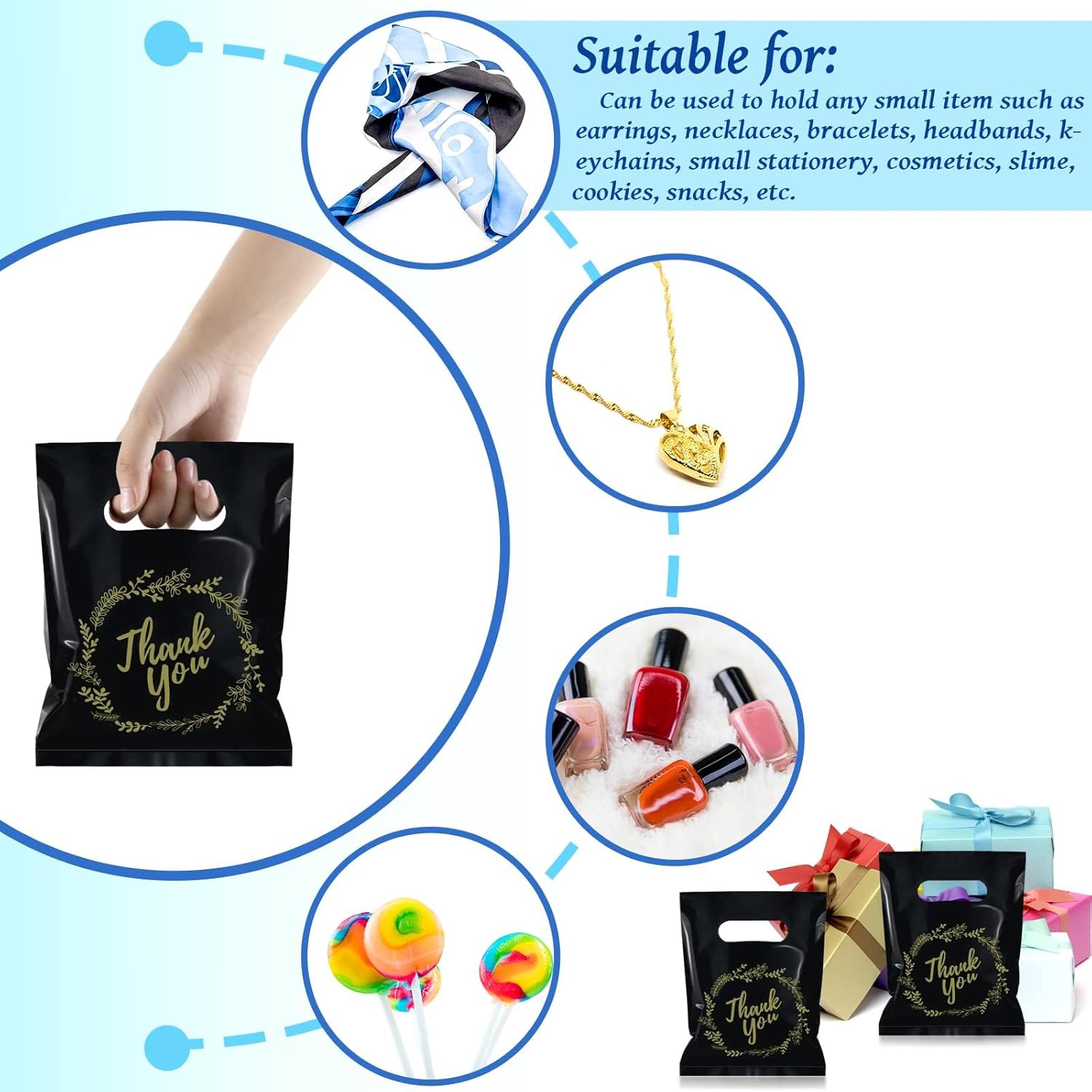 Application: plastic small thank you bags can be used to pack any small items like earrings, necklaces, bracelets, hair ties, keychains, small stationery, makeup, cookies, treats etc. Ideal for shops, supermarkets, small businesses, weddings, birthdays, parties, Christmas, Halloween