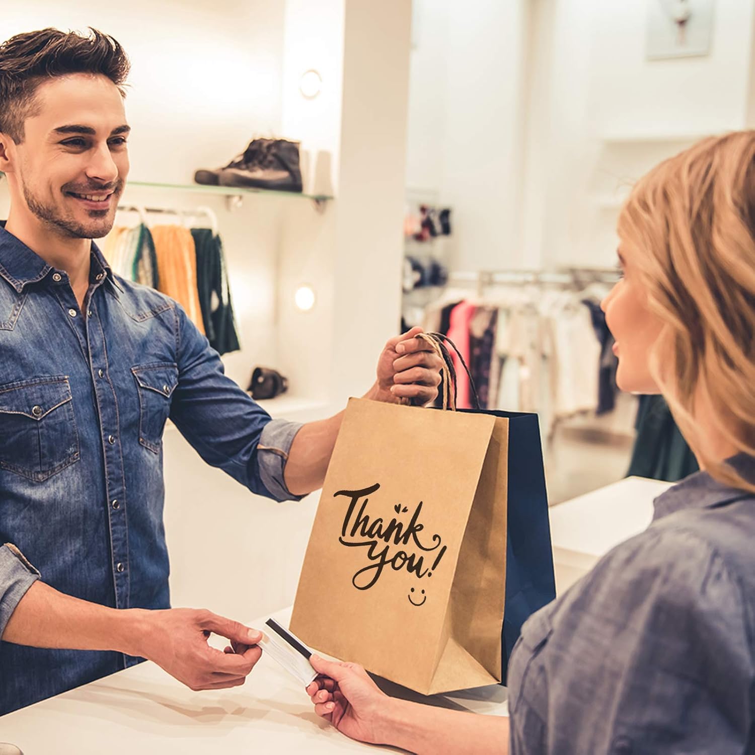 Thank You Paper Gift Bags. The brown bags with black color thank you artwork on both sides could be decorated for different holidays as gifts bags to your special ones. Also, you could stamp the shopping bag’s outside with your logo on. The smile face could make people feel happy when they receive it. Perfect for your business.