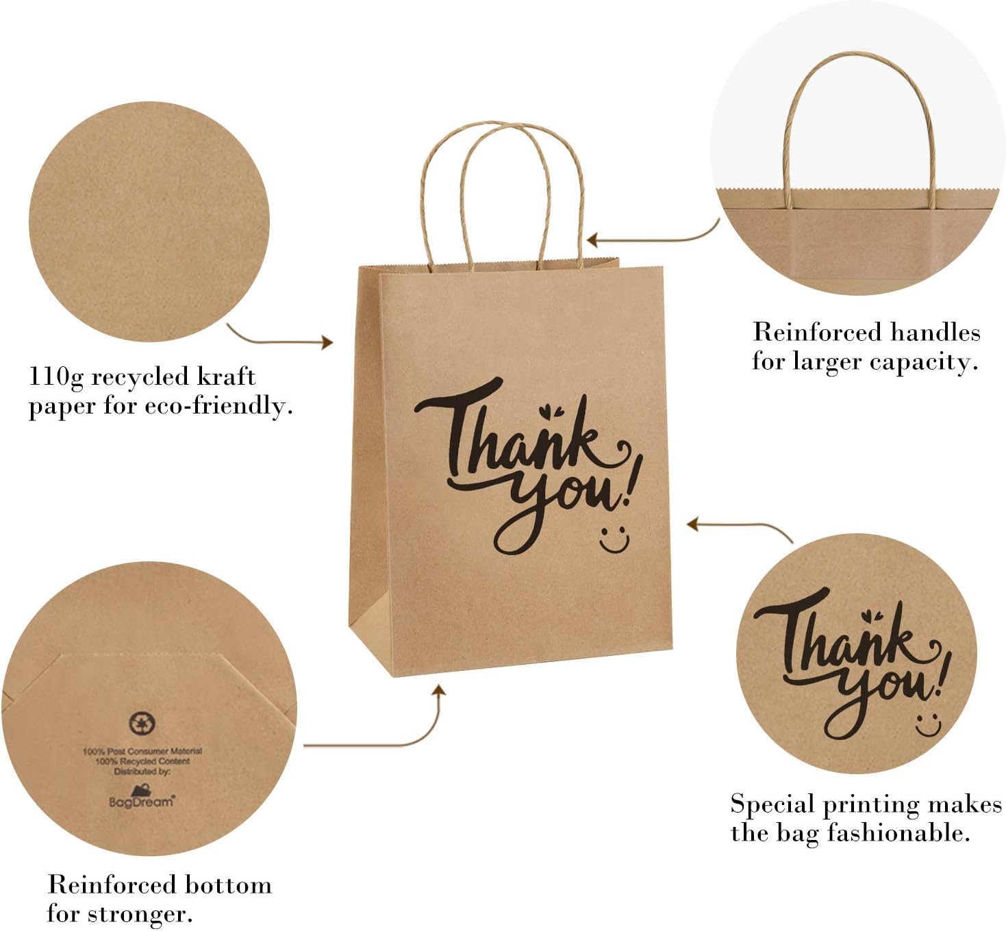 Eco-friendly Paper Bags. BagDream kraft brown paper bags are RECYCLABLE, no peculiar smell and look a lot classier than those plastic as gifts bags. These brown thank you gift bags are made of Recyclable Paper. FSC COMPLIANT.