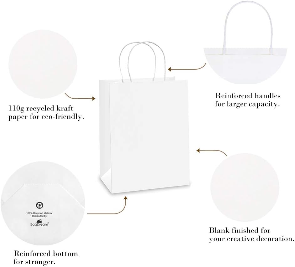 Eco-friendly Paper Bags: These white gift bags are made of 100% Recyclable Paper. FSC COMPLIANT. BagDream kraft paper gift bags are RECYCLABLE, no peculiar smell and look a lot classier than those white plastic ones as gifts bags