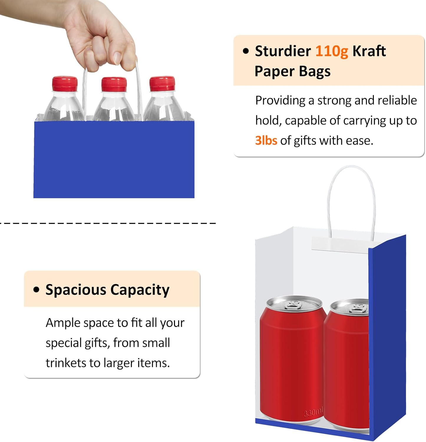 Small Gift Bags: 5.25″L x 3″W x 8″H. Crafted from durable paper with an appropriate thickness, securely glued handles and reinforced bottom, these blue paper bags are strong enough to carry small items without tearing