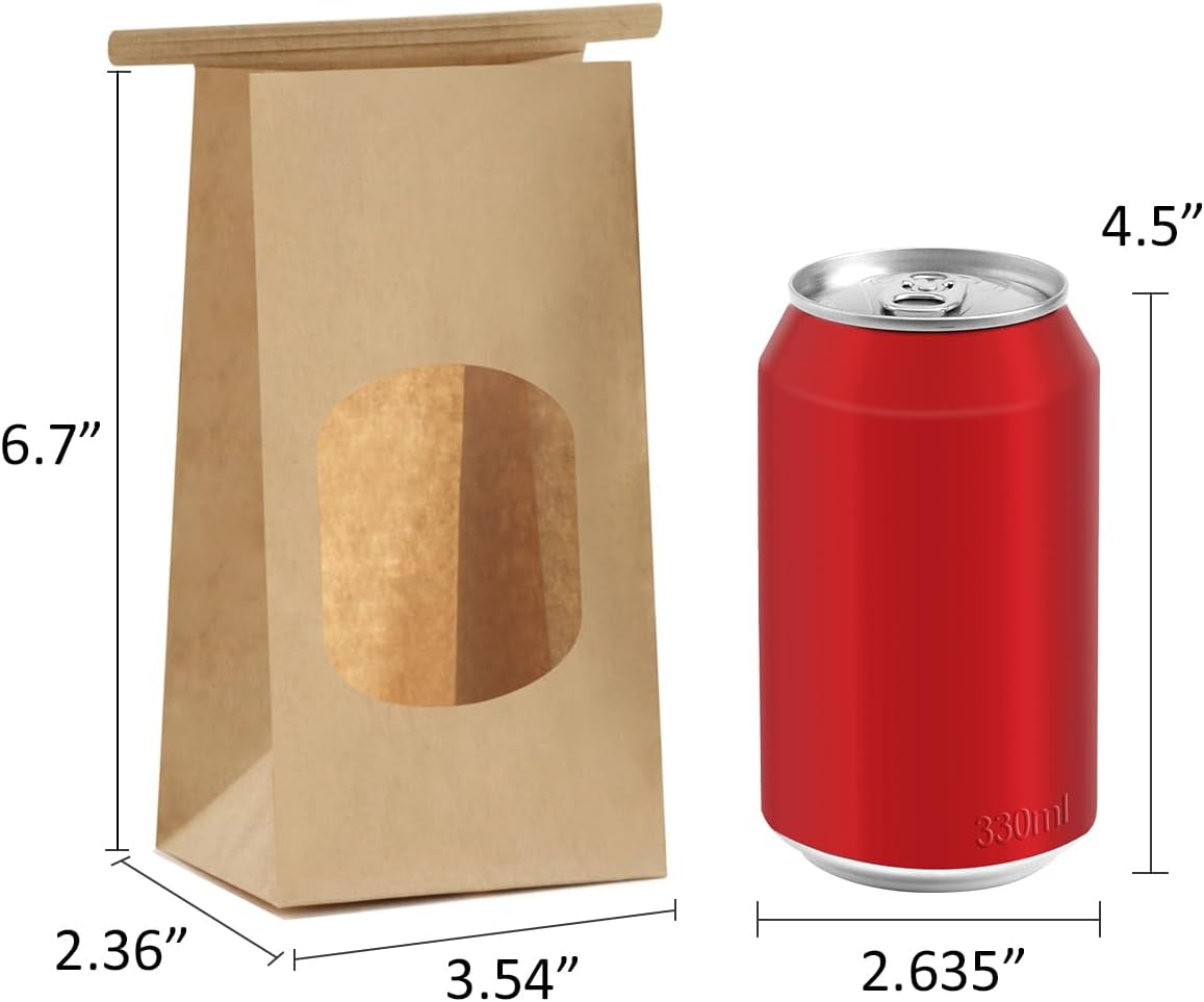 Small Bakery Bags Size: 3.54×2.36×6.7″. Nice window bags as gift for 8oz roasted coffee beans, cookies, granola, trail mix, popcorn, candy bar, goodie and etc