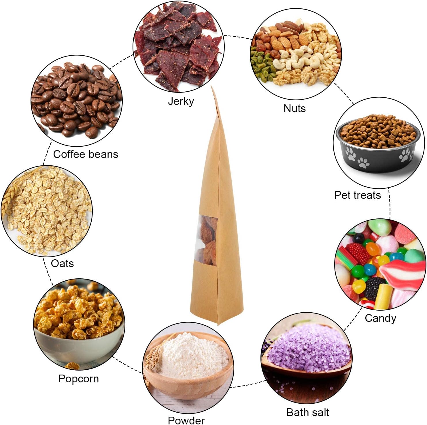 WHAT YOU GET-Comes with 50 pieces resealable kraft paper bags; Food in the picture is not included.Outer dimensions:4″x6″, The essential internal dimensions for your item are 3.2″ x 4.3″(L x H); Bottom: 1.2″ (Width). Remember: the type and volume of your packing material will affect the size needed. Please simply measure your item with a ruler. Then, check it with our detailed sizing diagram.