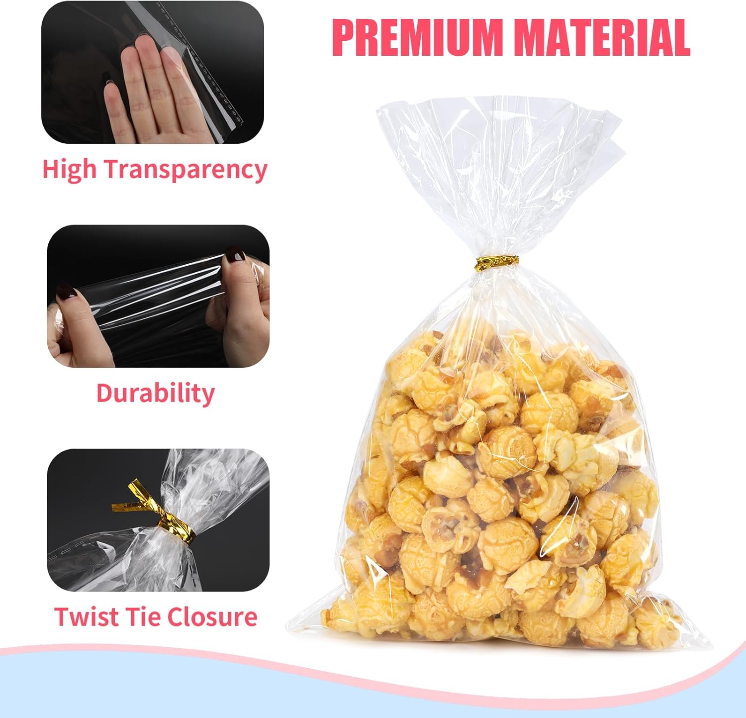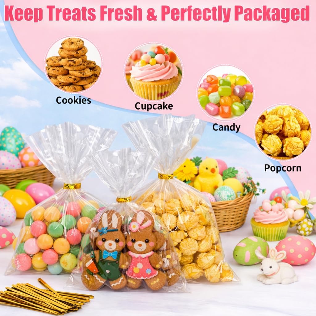 Complete Set: 100 Bags + 100 Gold Twist Ties – Everything you need to prep quickly: 100 clear flat bags plus 100 metallic gold ties for a clean, gift-ready finish. Great for busy parents, teachers, and party hosts.