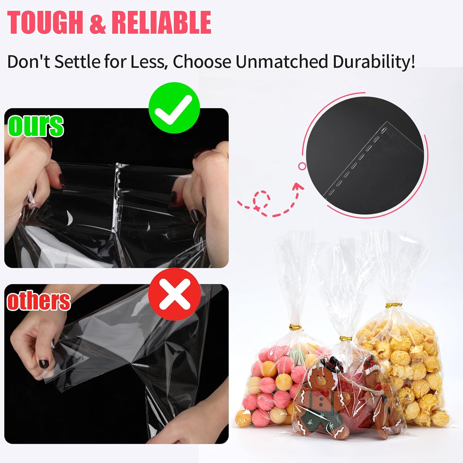Fabricadas en plástico OPP de 2.0 mil de grosor, estas bolsas de celofán son duraderas y resistentes a desgarros, asegurando que tus productos permanezcan seguros y protegidos. El material grueso evita rasgaduras y perforaciones, lo que hace que estas bolsas sean ideales para cualquier ocasión, desde cumpleaños y bodas hasta fiestas de fin de año o baby showers. Ya sea que estés empaquetando bocadillos, regalos o artículos especiales, estas bolsas de celofán transparentes ofrecen una solución elegante y atractiva para todas tus necesidades de empaquetado.