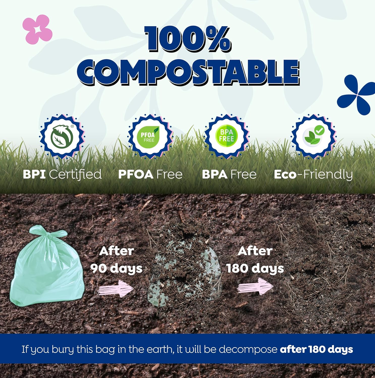 100% Compostable At Home: Got kitchen scraps and other food waste? What about leaf litter from your garden? Both of those can be bagged in our biodegradable trash bags and thrown in your compost pile. In 180 days (6 months), it will have broken down completely. BPI Certified.