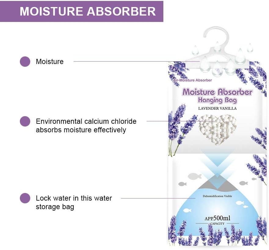 Hanging Bag Moisture Absorber absorbs and traps excess from the air ,helps us get rid of damp.Lavender Vanilla scents.