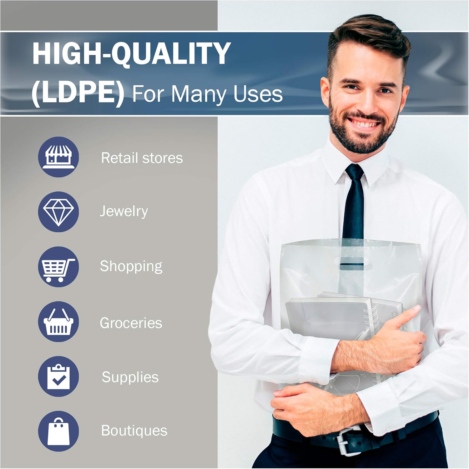 Every pack comes with 100 plastic bags in bulk, easy to bend and transport, you can choose many sizes and colors, giving a personalized touch for your brand. The durability and reusability adds an extra value for your customers and your store.
