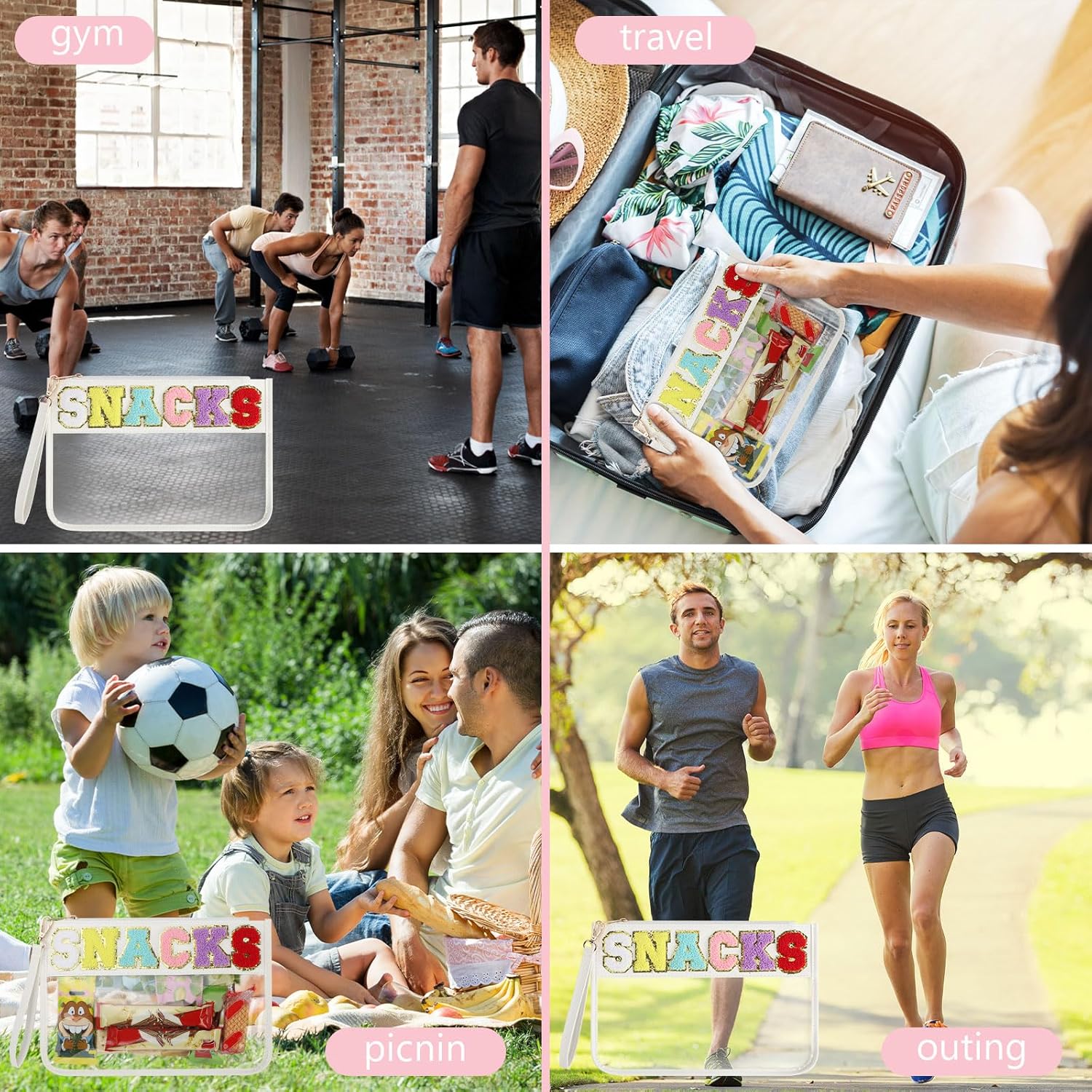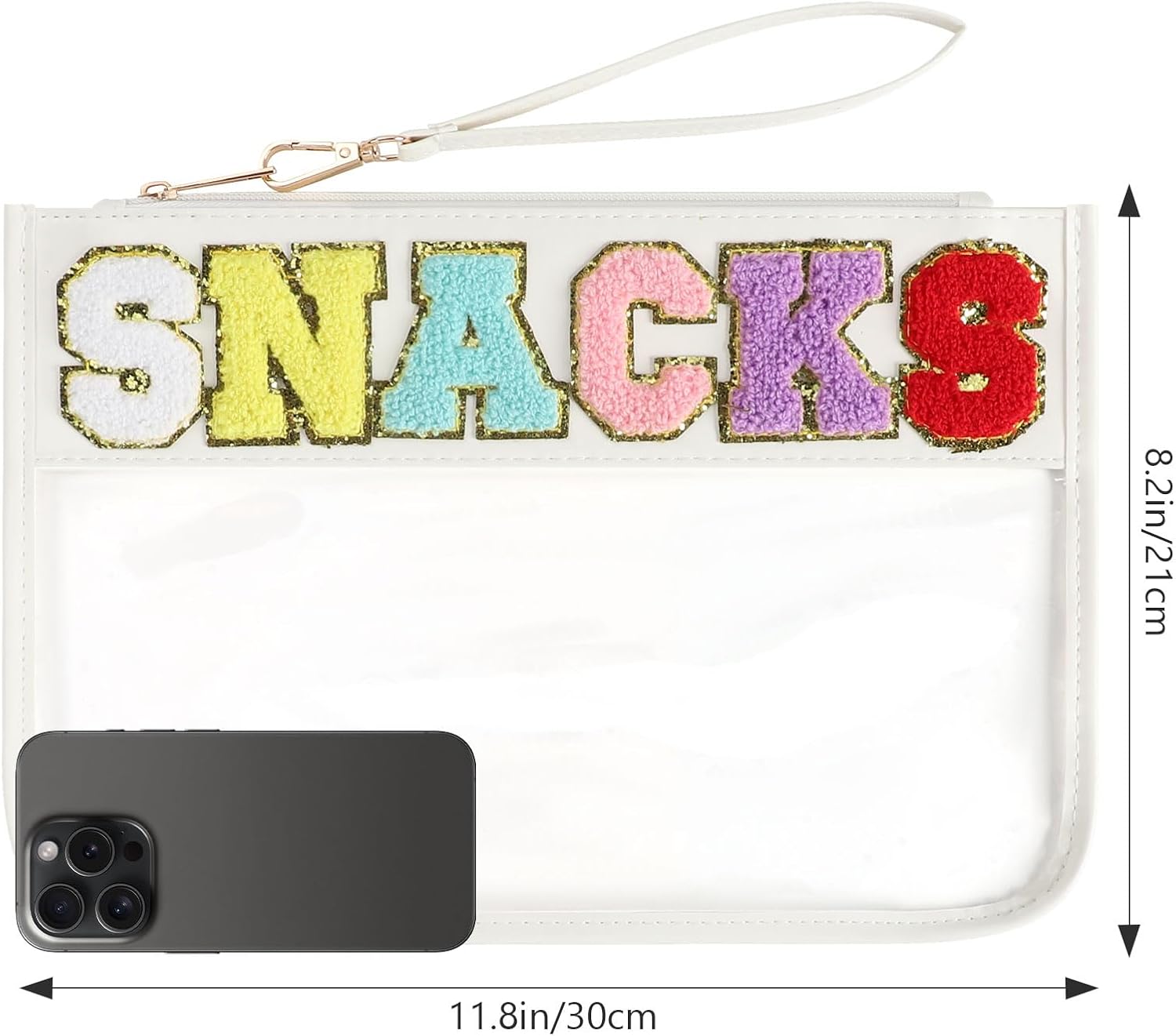 Clear Snack Bag for Travel, Chenille Letter Clear Zipper Snacks Pouch Nylon Cosmetic Bag Makeup Travel Bag for Women
