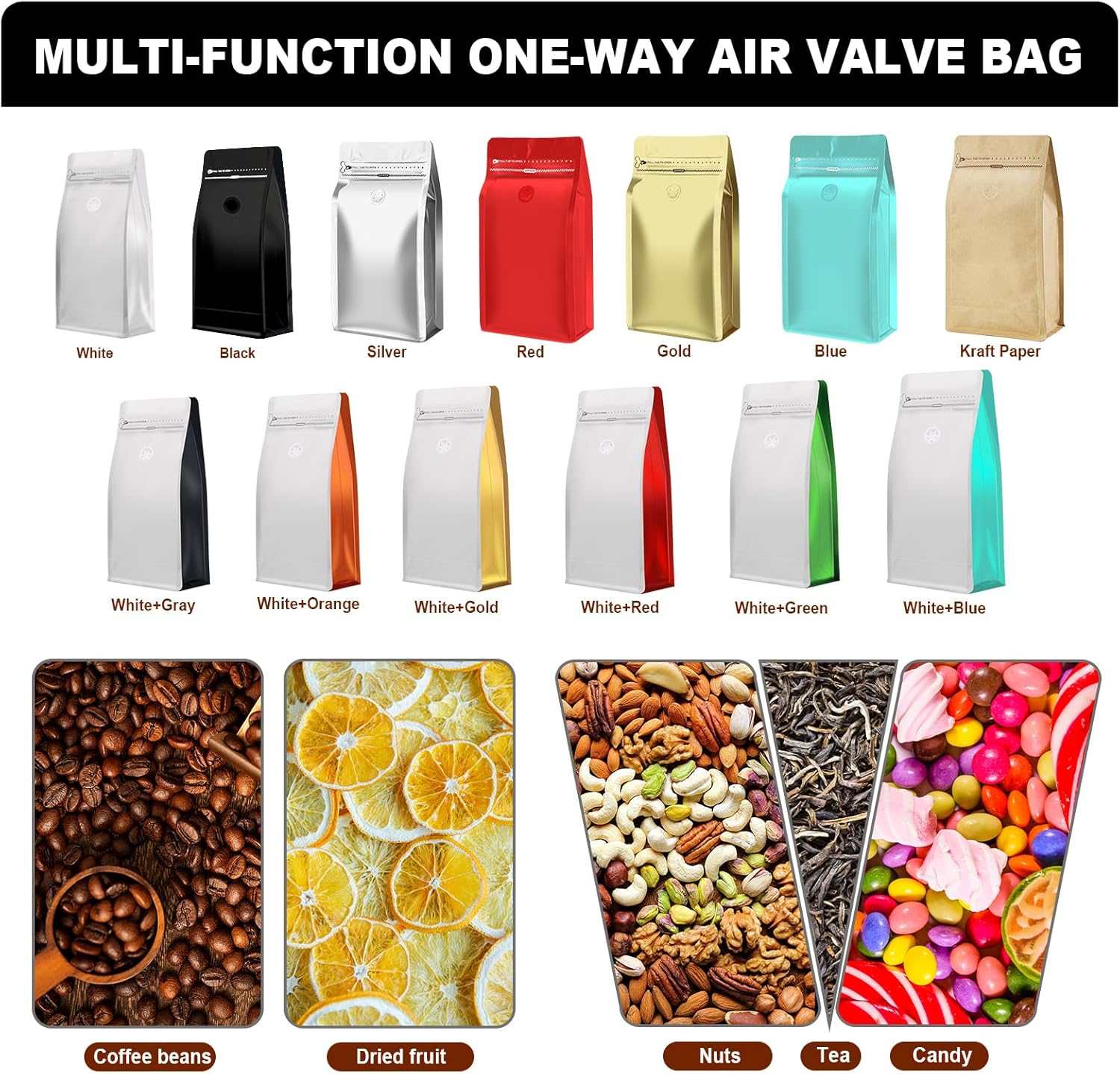 How to use: [1.Put the items to be stored 2.Use sealing machine(we have not sell it) to seal the top of the bag 3.Squeeze out the air from the bag through the degassing valveThe one-way air valve keeps the coffee beans and roasted coffee fresh. Excess gas flows from the inside to the outside without returning gas, keeping food fresh.]