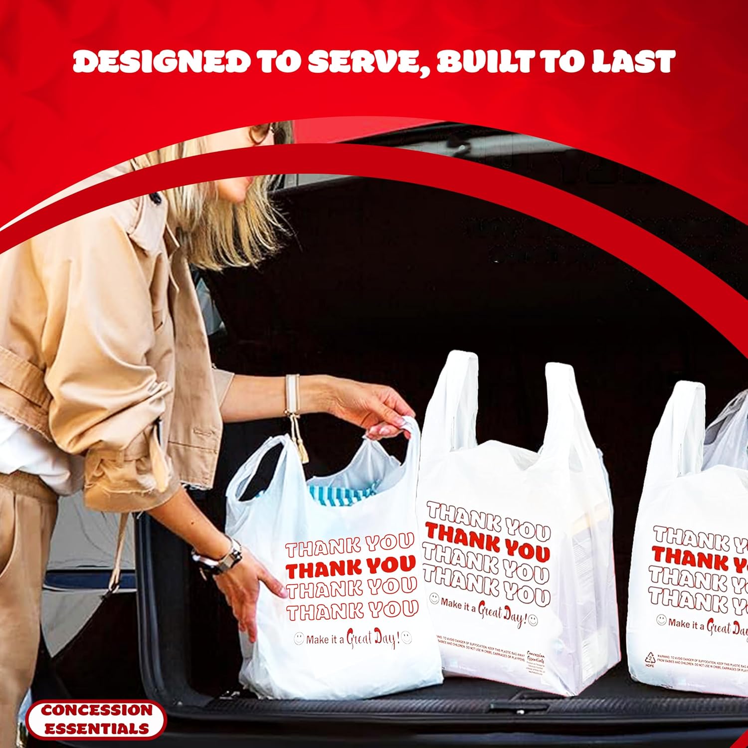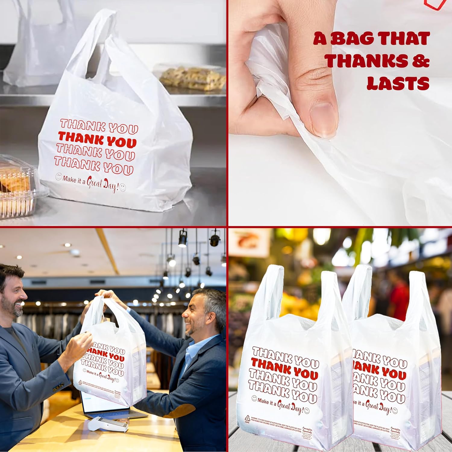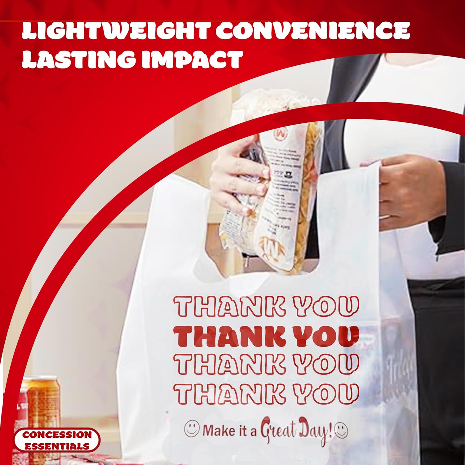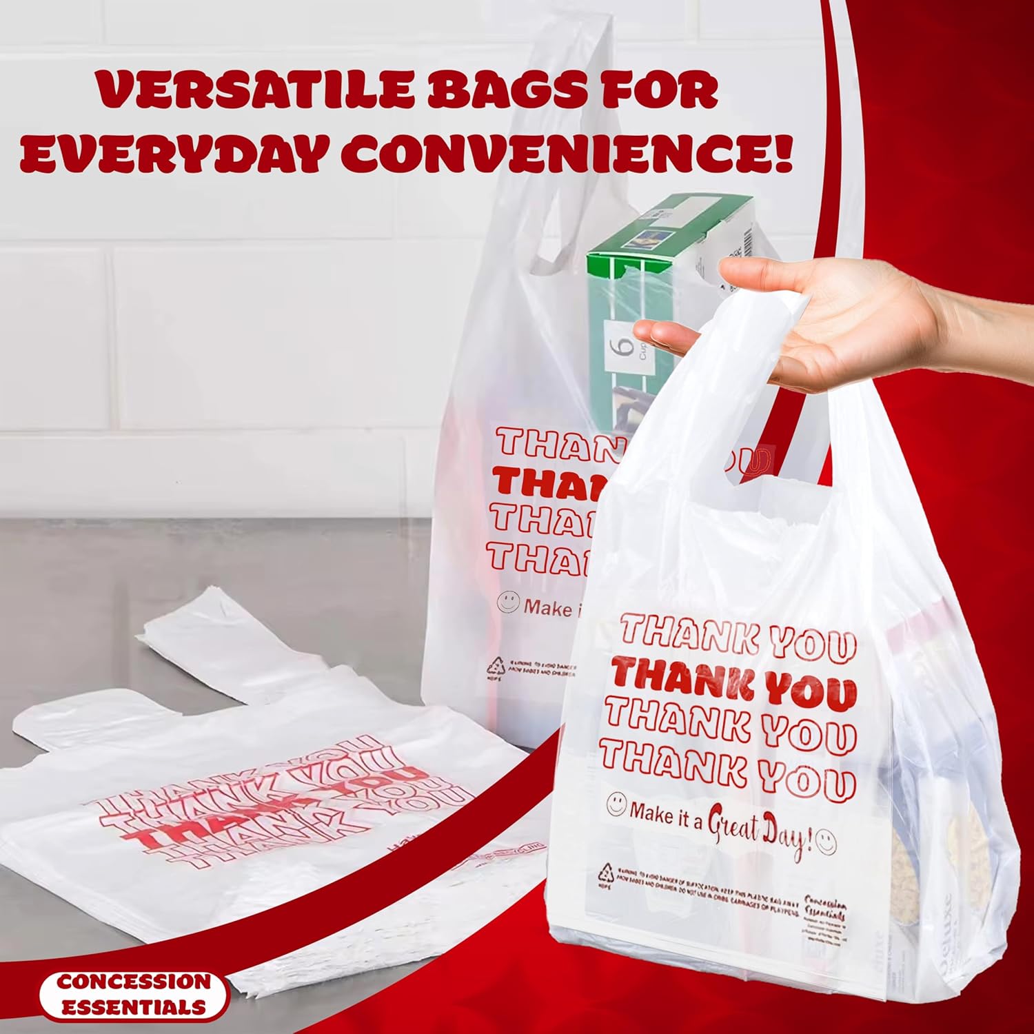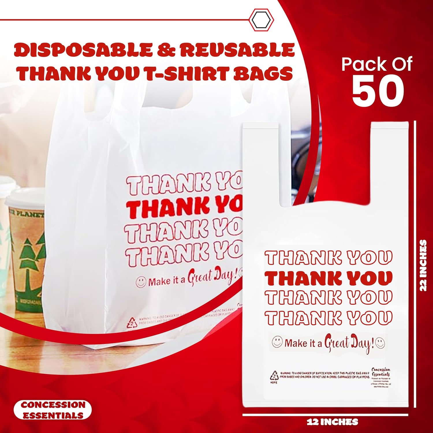 Concession Essentials Disposable & Reusable Thank You T-Shirt Bags – Pack of 50ct Effortlessly carry your purchases with the Concession Essentials Disposable & Reusable Thank You T-Shirt Bags. Designed for convenience, these versatile bags are ideal for retail stores, concessions, restaurants, and everyday use. Their durable construction ensures reliability, while the classic “Thank You” print adds a professional touch that leaves a lasting impression. Whether you’re bagging food, groceries, or other items, these bags are your go-to solution for quality and style. Key Features: Durable & Reliable Material: Made from high-quality polyethylene, these bags are tear-resistant and capable of holding a variety of items without breaking or stretching. Reusable & Eco-Friendly: Designed to be lightweight yet reusable, they help minimize waste while offering superior strength and performance. Generous Size: Each bag measures approximately 12 x 7 x 22 inches, providing ample space to accommodate groceries, concessions, and other items comfortably. Classic “Thank You” Design: Featuring a charming “Thank You” and smiley face print, these bags add a touch of gratitude and professionalism to every transaction. Multi-Purpose Functionality: Perfect for retail shops, restaurants, convenience stores, concessions, and even home use for storage or organizing. Convenient Pack of 50: Each pack includes 50 bags, ensuring you always have a reliable supply on hand for your business or personal needs. Easy Storage & Dispensing: The compact packaging allows for effortless storage and quick access whenever you need it. These Concession Essentials T-Shirt Bags are the perfect balance of functionality, durability, and affordability. Whether you’re running a bustling business or just need dependable bags for everyday tasks, this pack of 50 is sure to meet your needs with style and efficiency.