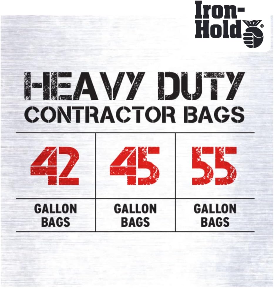 CONTRACTOR BAGS: Handle heavy duty needs with Iron-Hold 55 gallon contractor trash bags, package contains 15 bags, each 3.0 mil thick