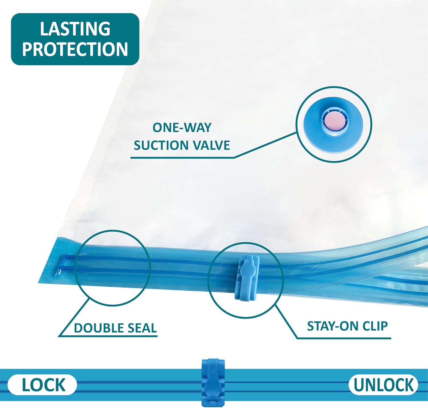 Reliable protection: With the triple-seal turbo valve & double-zip seal design, our cozy essential vacuum bags get the air out in the suction process. Can be used repeatedly.