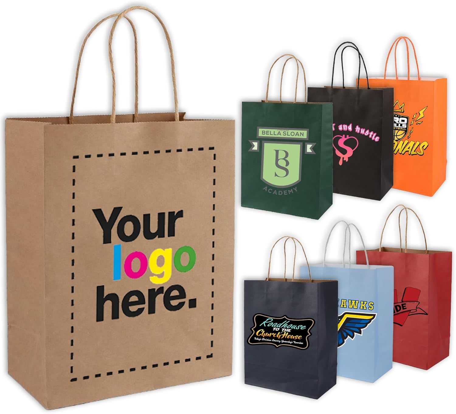 Custom Paper Bags 50-5000 PCS – Personalized Kraft Paper Bags with Logo for Small Business, 8×4.5×10.8 Inch Gift Bags with Handle, Reusable Goodie Bags for Duty Gift Bags, Food Safe, Retail, Wedding, Party Favors (Custom Design)