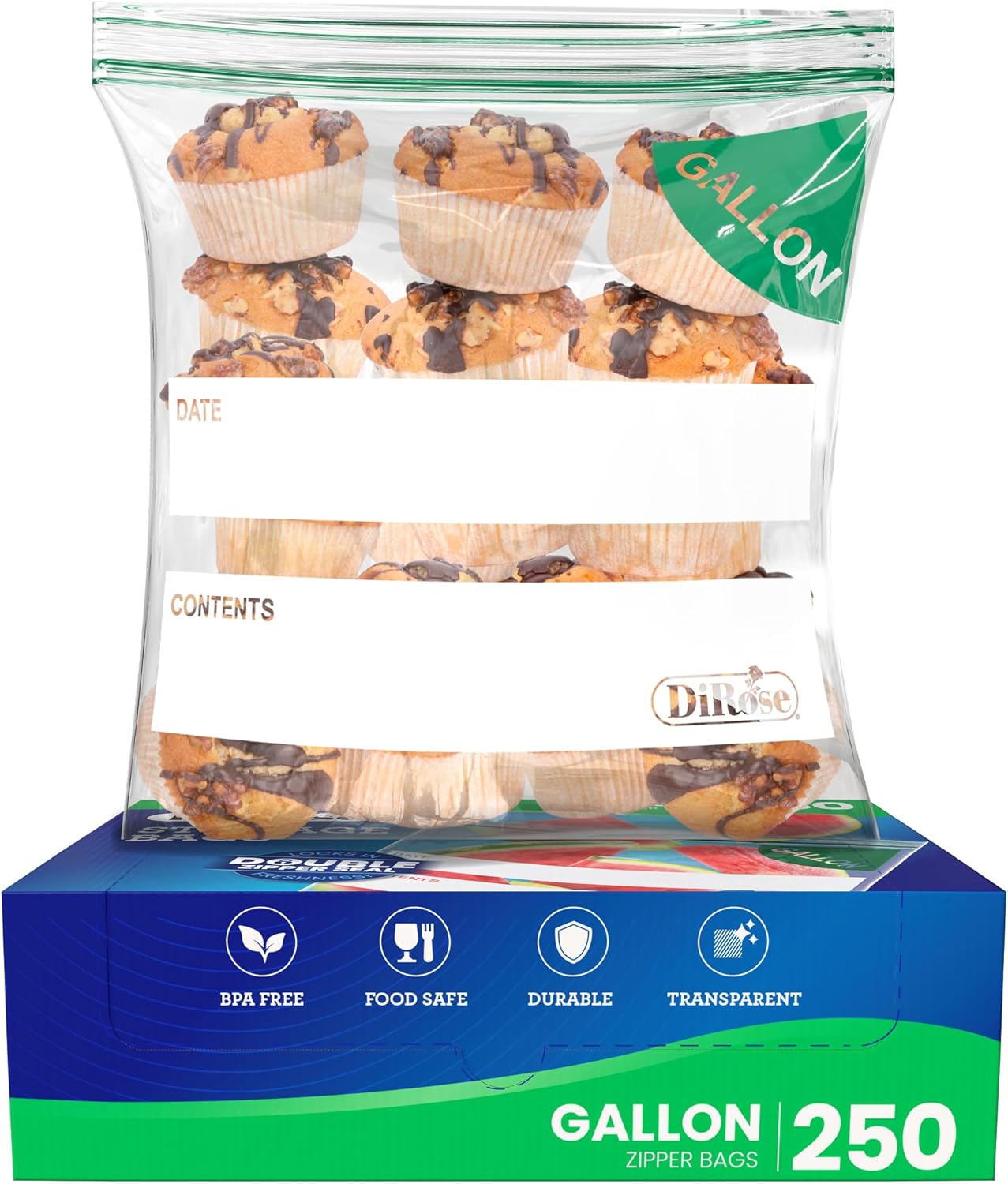 DiRose Gallon Bags Pack of 250 – 1 Gallon Reclosable Storage Bags – Practical and Durable Design – Food Safe Non-BPA Material – Easy Zip Closure – Ideal for Food, Snacks, Dog Treats, Organizing