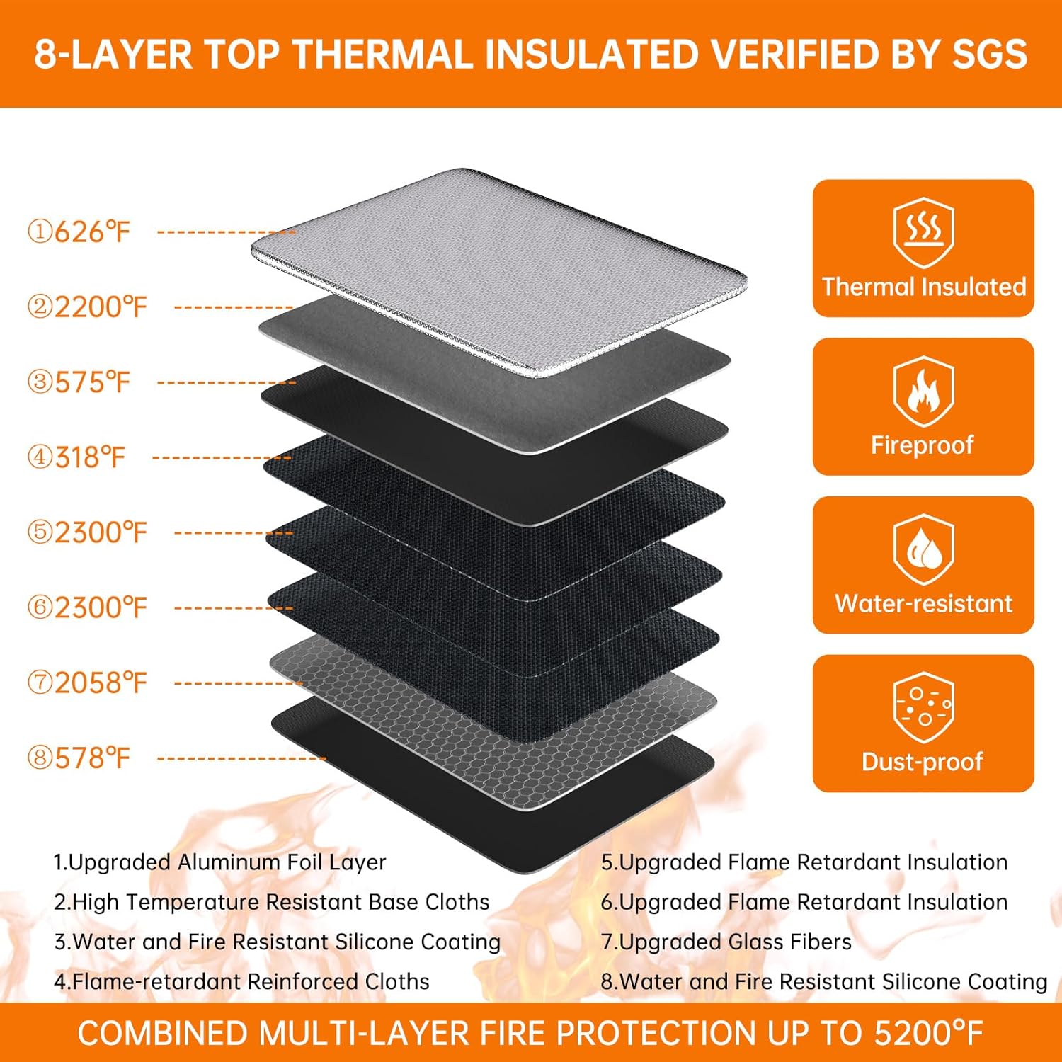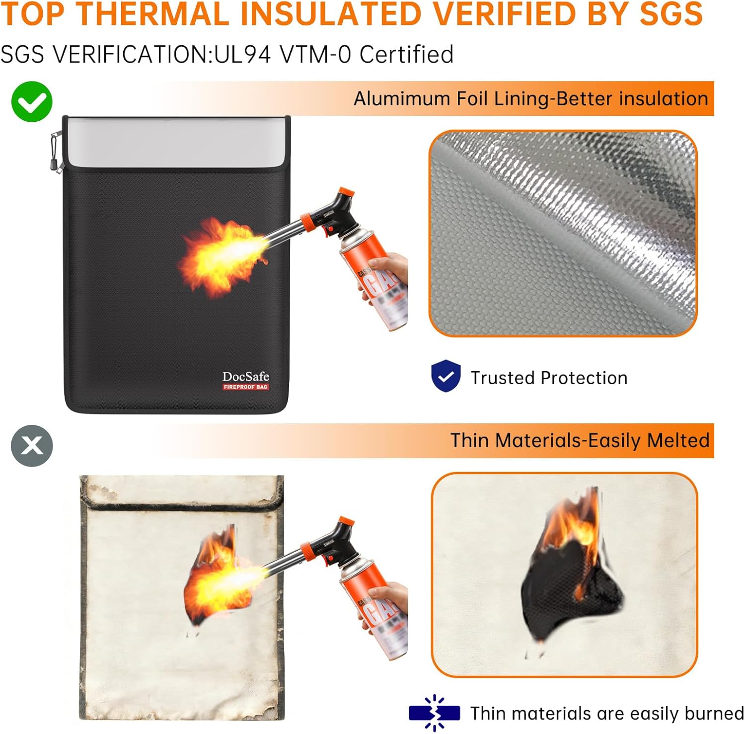 5200°F Fireproof Resistant Insulation Protection: DocSafe 5200°F fireproof document bags are made of 10mm premium fire-retardant, non-itchy silicone-coated fiberglass, thickened fireproof aluminum foil which can stands up against fire and passed the UL classified and SGS TEST (UL-94 VTM-0 Burning Test). The multi-layer material protection of the fireproof bag can withstand temperatures of up to 5200℉, completely protecting documents and valuables from fire damage