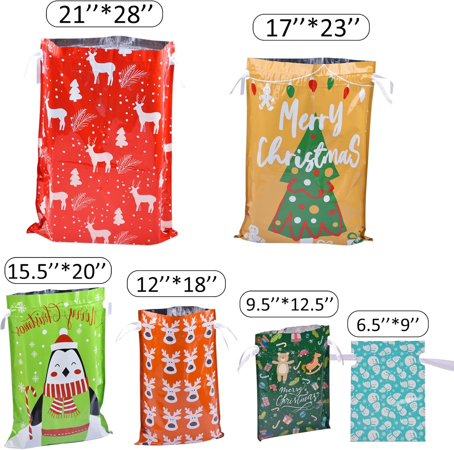 Drawstrings Christmas Gift Bags Assorted Sizes, 34Pcs Holiday Gift Bag Bulk Christmas Bags For Gifts, Reusable Plastic Xmas Presents Wrapping Bags Favor Goody Bags Jumbo/Extra Large/Medium/Small Size