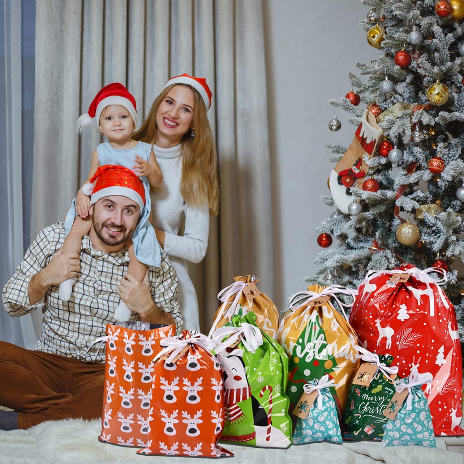 【Christmas Gifts Bags With Drawstrings】Make gift wrapping simple and time-saving. Just drop the gift in, pull the ribbon ties, tie a bow.DONE. Especially clothes and other odd-shaped items. No boxes, cutting, creasing, or decorating. These gift bags have everything you need for gift wrapping-beautiful printed, small gift tags, various size decorative gift bags.