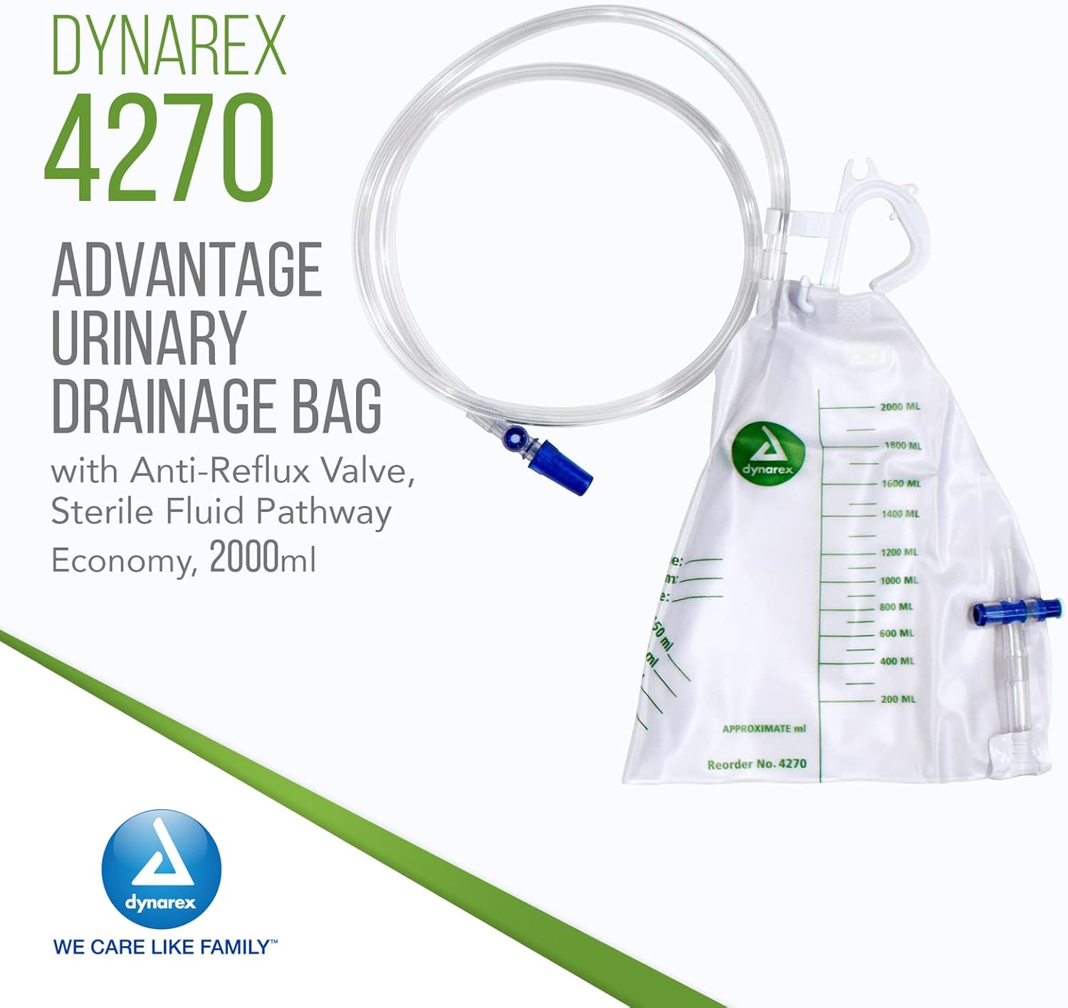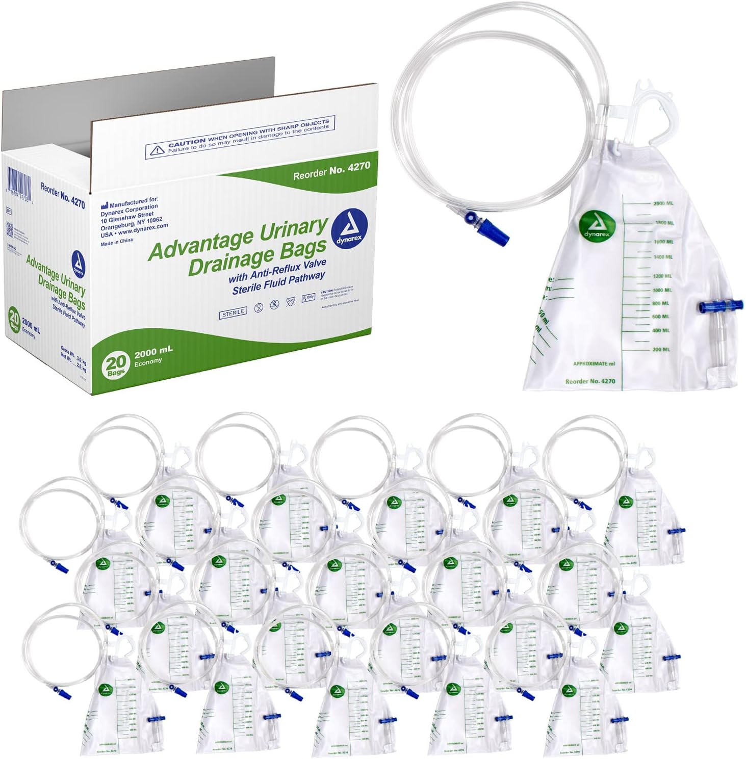 Dynarex Advantage Urinary Drainage Bag – Teardrop-Shaped, Unisex, Anti-Reflux Chamber, No-Needle Sample Port, Universal Hanger – Vinyl Bags with Markings – 2000ml, 20 Count