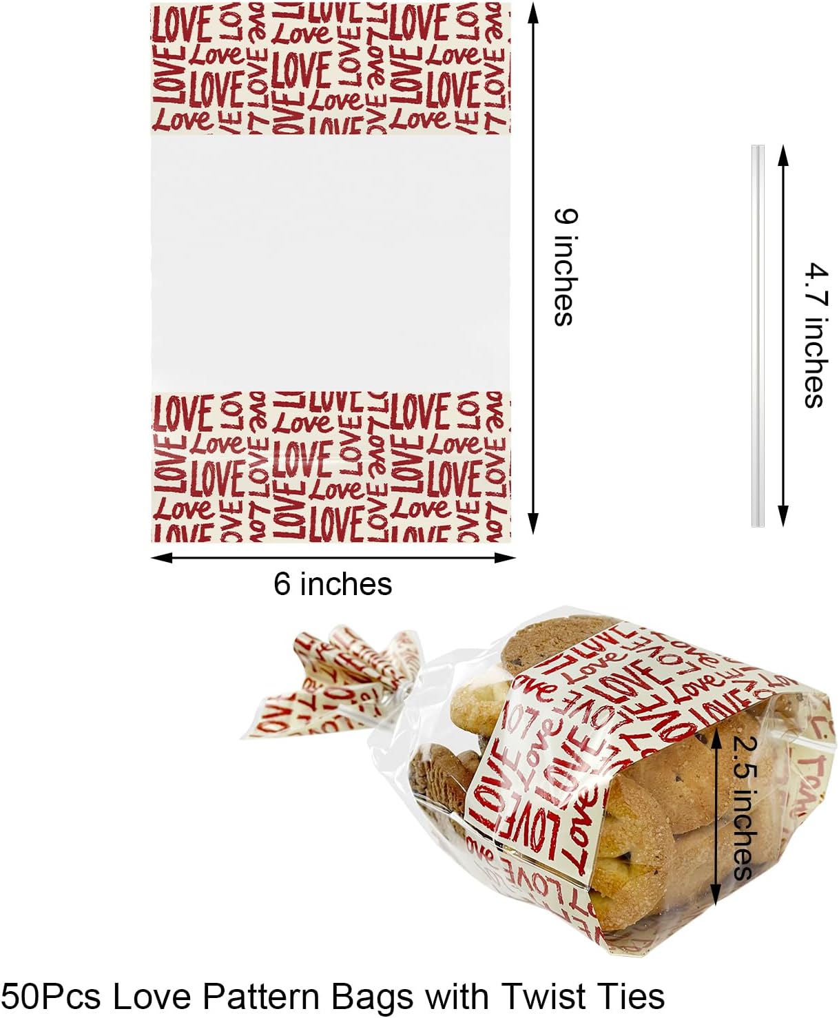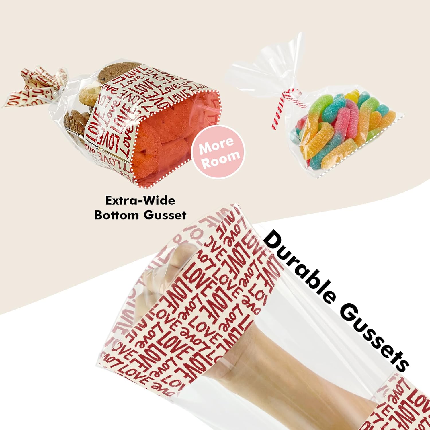 EKAPACKAGING 50Pcs 6×9 Inches Cellophane Treat Bags with Twist Ties, Love Pattern Bottom Gusseted Bags, Flat Bottom Popcorn Cookies Bags, Valentine’s Day Goodie Bags for Bakery, Wedding, Classroom